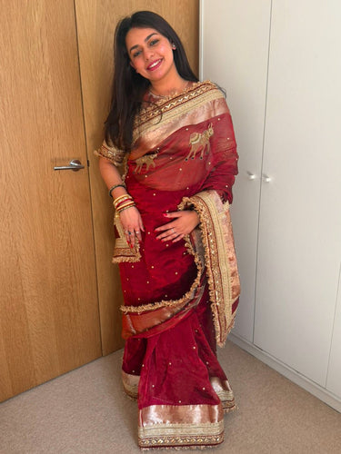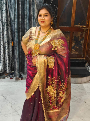 Elegant wine Banarasi silk, rich hand embroidery, truly timeless beauty.