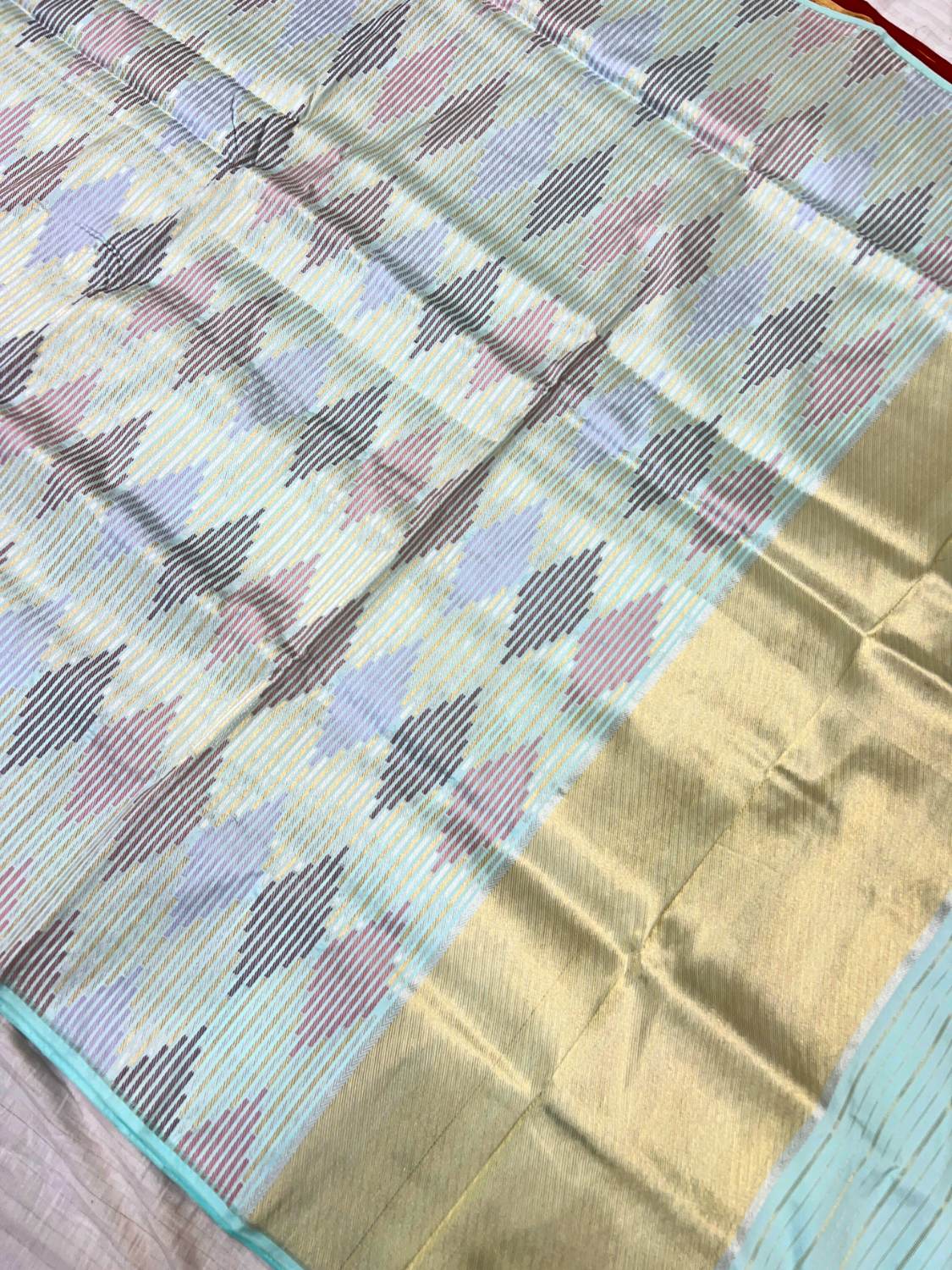 This elegant Banarasi phekwa silk saree features a refreshing aqua green base that beautifully enhances the intricate woven design. The body showcases a striking geometric pattern created through fine phekwa weaving, where soft pastel shades blend harmoniously with delicate zari lines, giving the saree a graceful and contemporary appeal. The subtle zari striped detailing adds texture and movement to the fabric, while the refined border enhances the overall sophistication of the design. The lightweight silk fabric offers a smooth texture, natural sheen, and comfortable drape, making it ideal for long hours of wear. Perfect for festive gatherings, celebrations, and elegant day occasions, this Banarasi phekwa saree blends traditional weaving techniques with a modern aesthetic, creating a timeless and versatile piece.