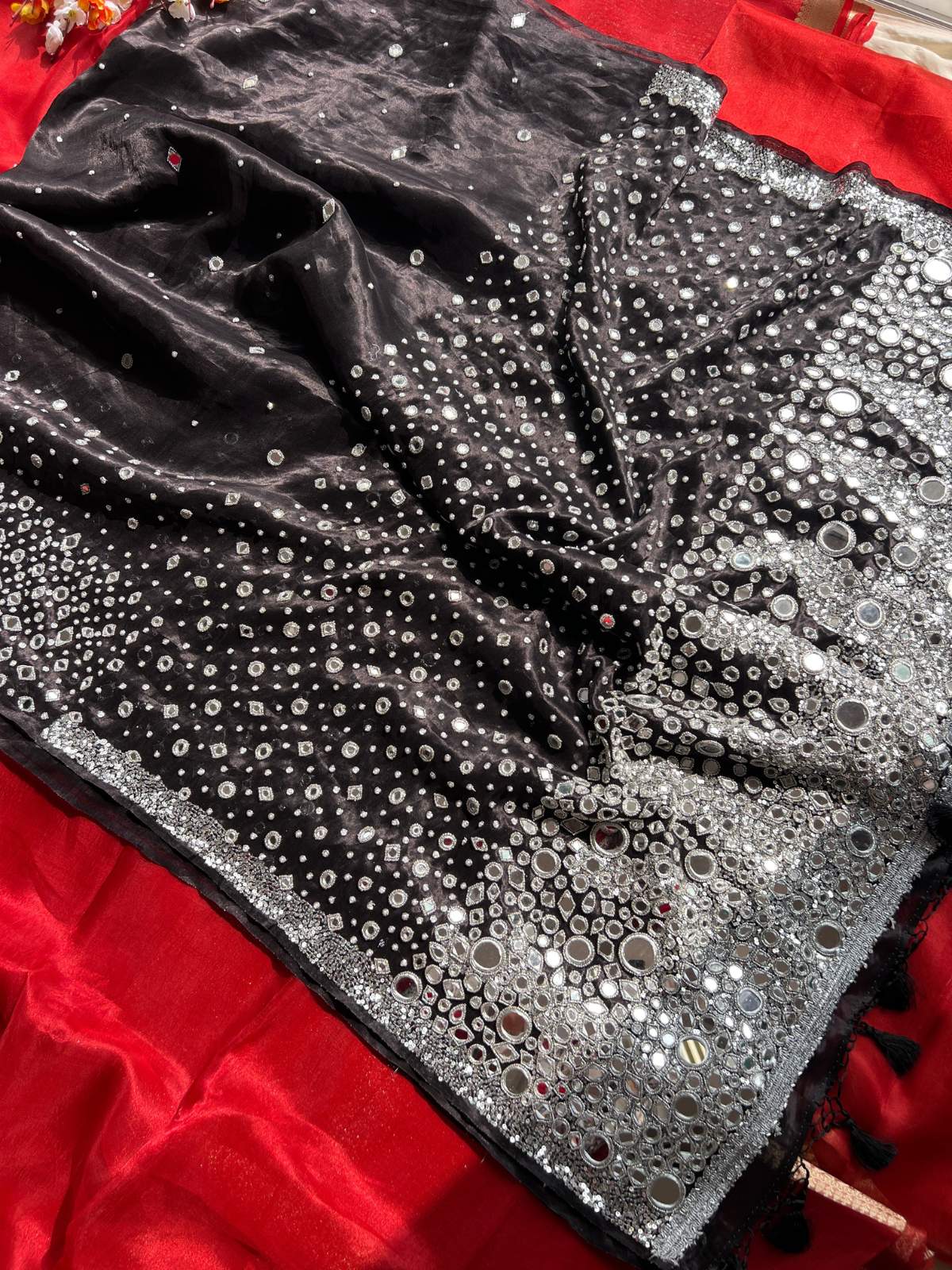 Introducing the Shish Mahal Saree, a luxurious masterpiece crafted from 100% pure Banarasi tissue silk in a stunning classic black and silver color combination. This best saree showcases the richness of Banarasi silk with a soft tissue silk sheen and exquisite all-over mirror work, creating a dazzling, palace-inspired look. The highlight is the beautiful hand embroidery on the border, adding refined elegance and royal charm. Lightweight yet opulent, this Banarasi tissue silk saree drapes effortlessly, making it perfect for weddings, festive occasions, evening functions, and grand traditional celebrations.