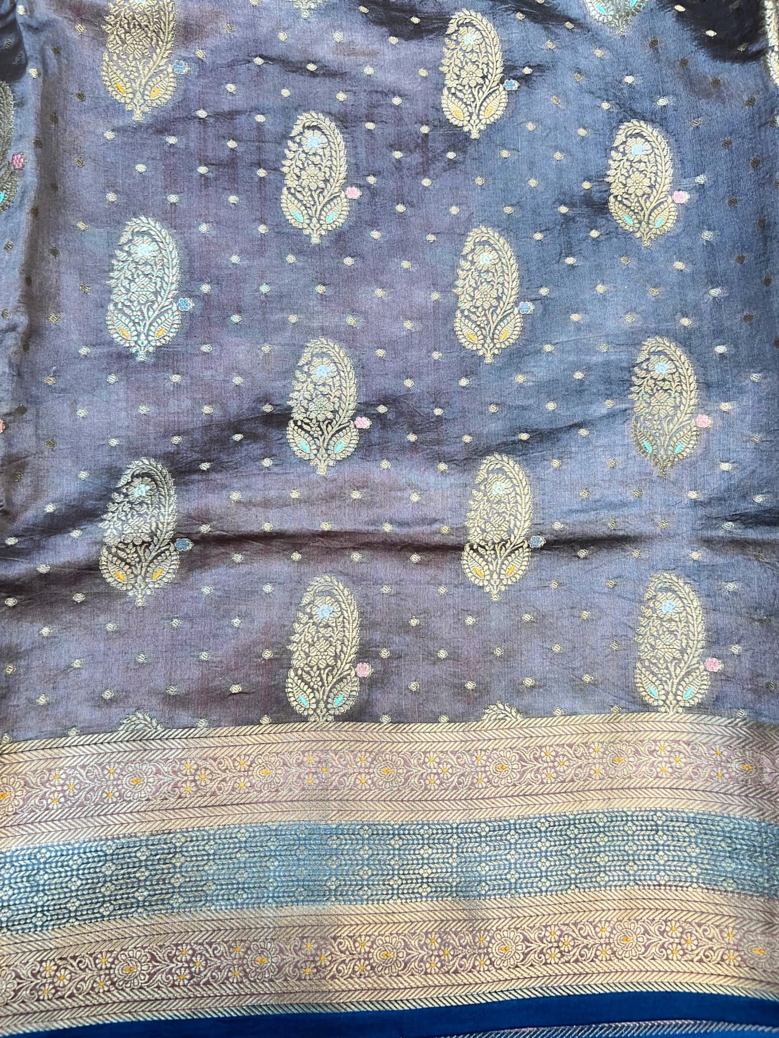 Discover the epitome of heritage luxury with this exquisite handloom Chiniya Silk saree. Featuring magnificent antique zari Meenakari paisley bootas on a lustrous body, and a contrasting, intricately woven pallu. The elegant dual-tone silk drapes beautifully, offering a sophisticated, timeless statement. Perfect for grand weddings, exclusive festive gatherings, and celebrating life's most cherished moments. A truly unique and sought-after piece for your treasured collection