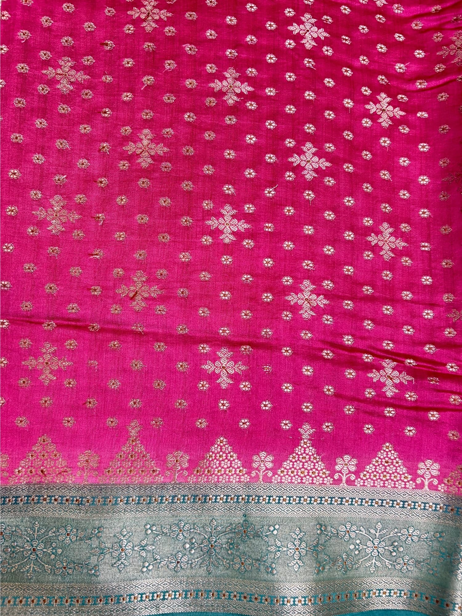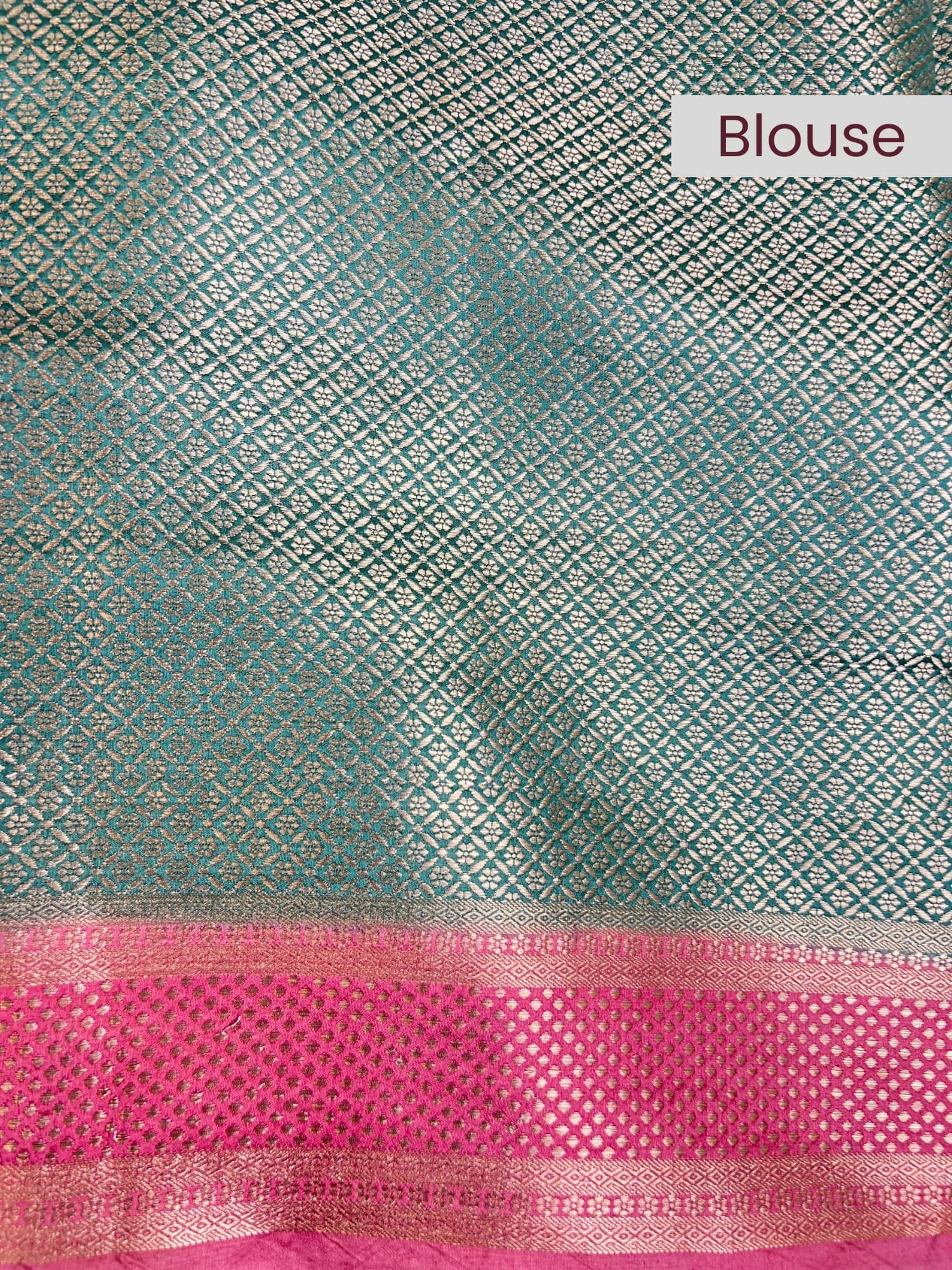 A stunning pink Banarasi saree with intricate silver zari motifs and a contrasting teal blouse. Crafted in pure tissue silk, this elegant saree is perfect for weddings and festive occasions. Shop premium handwoven Banarasi elegance.