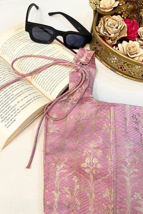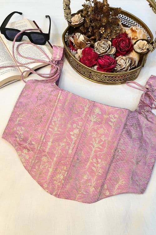 From our Naaz & Nakhra collection – elevate your festive look with this Light Pink Banarasi Brocade Corset, featuring delicate Gold Zari floral patterns. Designed with boning, padded cups, a side zipper, and a flattering square neckline, it’s the perfect blend of elegance and structure.