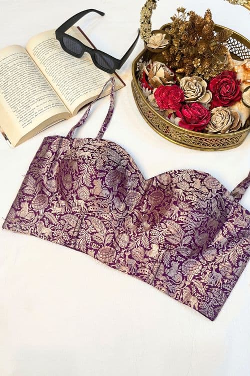 From our Naaz & Nakhra collection – discover the perfect blend of tradition and trend with this Purple Banarasi Brocade Corset. Featuring detailed Shikargah motifs in Silver Zari on luxurious Banarasi silk, it offers a flattering structured fit with boning, padded cups, and a back zipper. A must-have statement piece for festive and party wear.