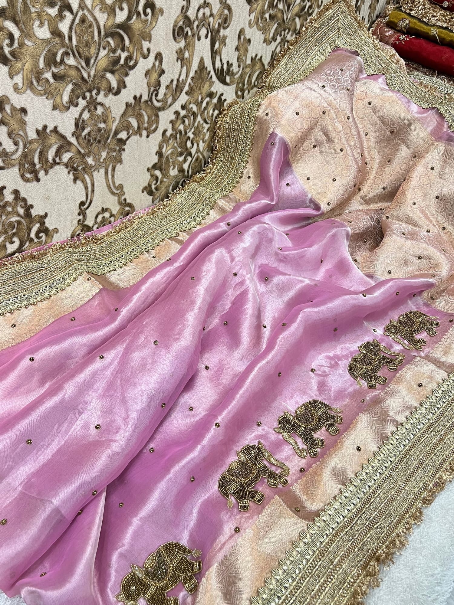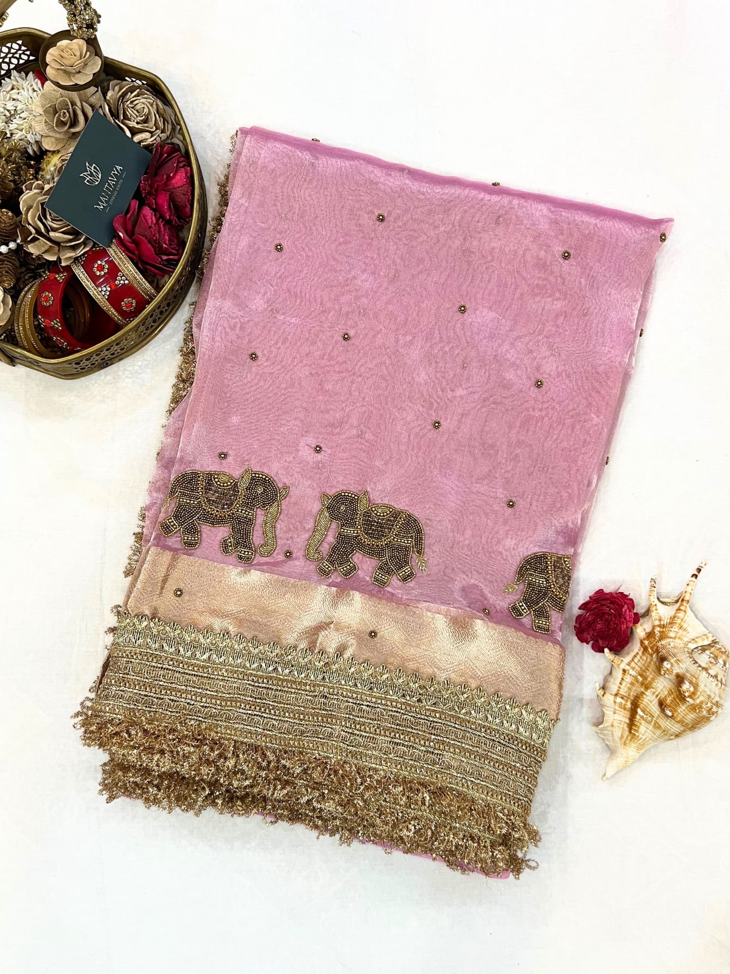 Hand-Embroidered Baby Pink Tissue Silk Saree with Elephant Motifs