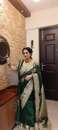 This beautiful Green Tissue Silk Saree is hand-embroidered with charming elephant motifs—symbols of strength and royalty. Designed in Banaras with gota patti borders, it’s perfect for weddings, festivals, or any special celebration where you want to feel graceful and unique.