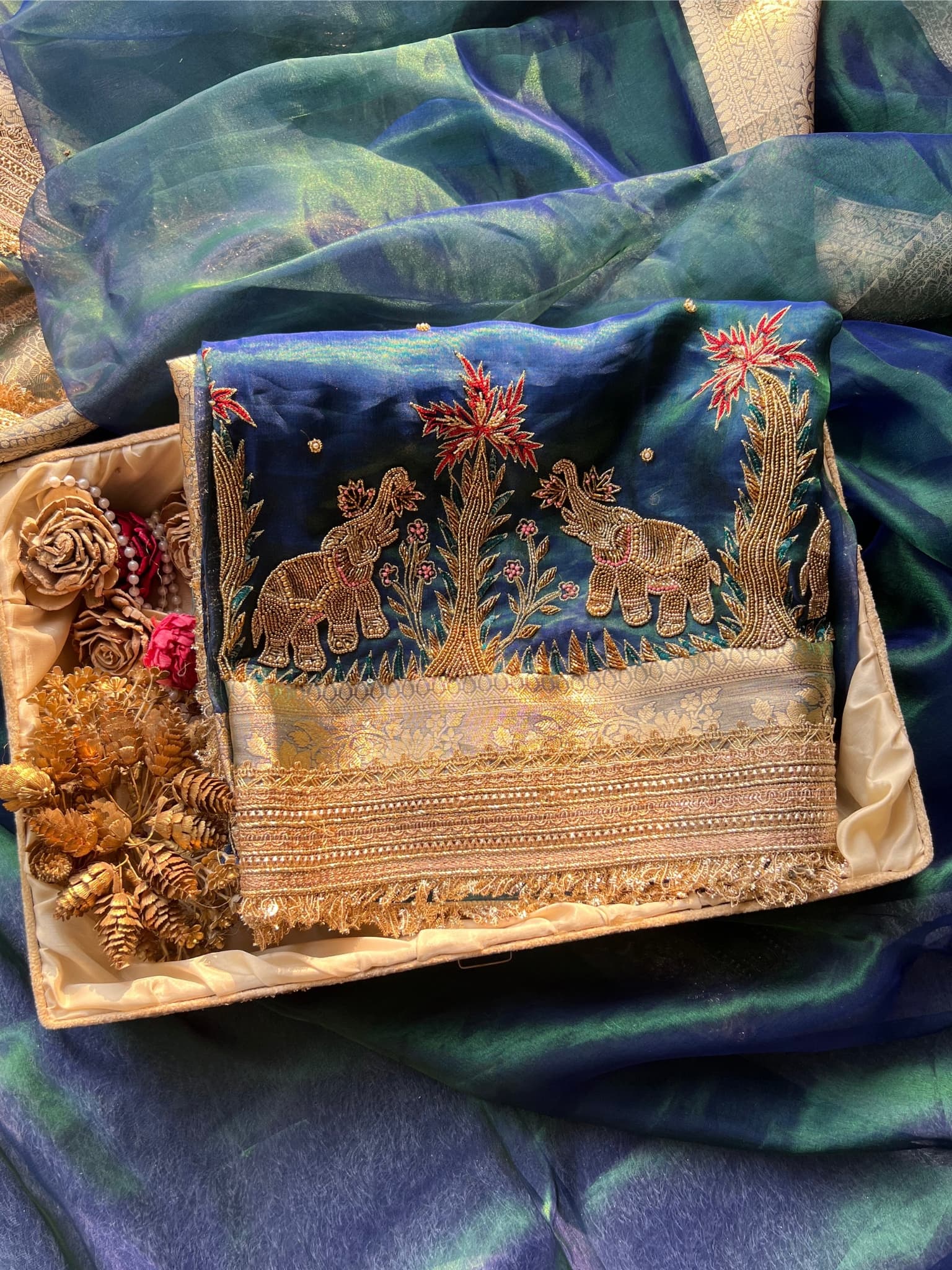 This stunning saree from our Gajgamini collection features rich Peacock Teal Blue tissue silk, hand-embroidered with twin golden elephants amidst lush palm motifs. Intricate beadwork and pearl-detailed borders add timeless charm — perfect for weddings, festivities, or any special celebration.