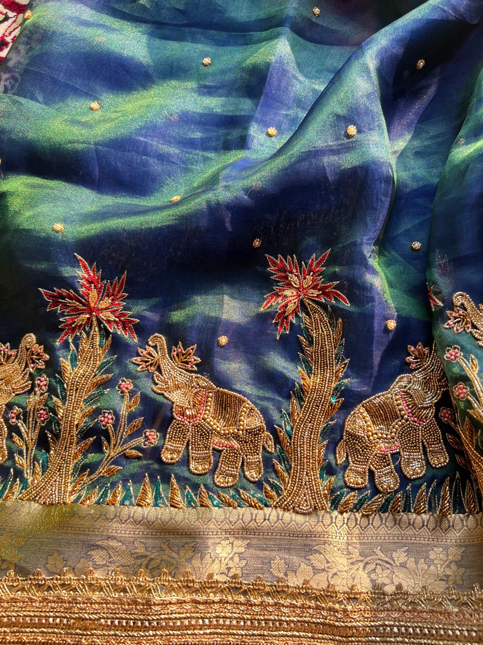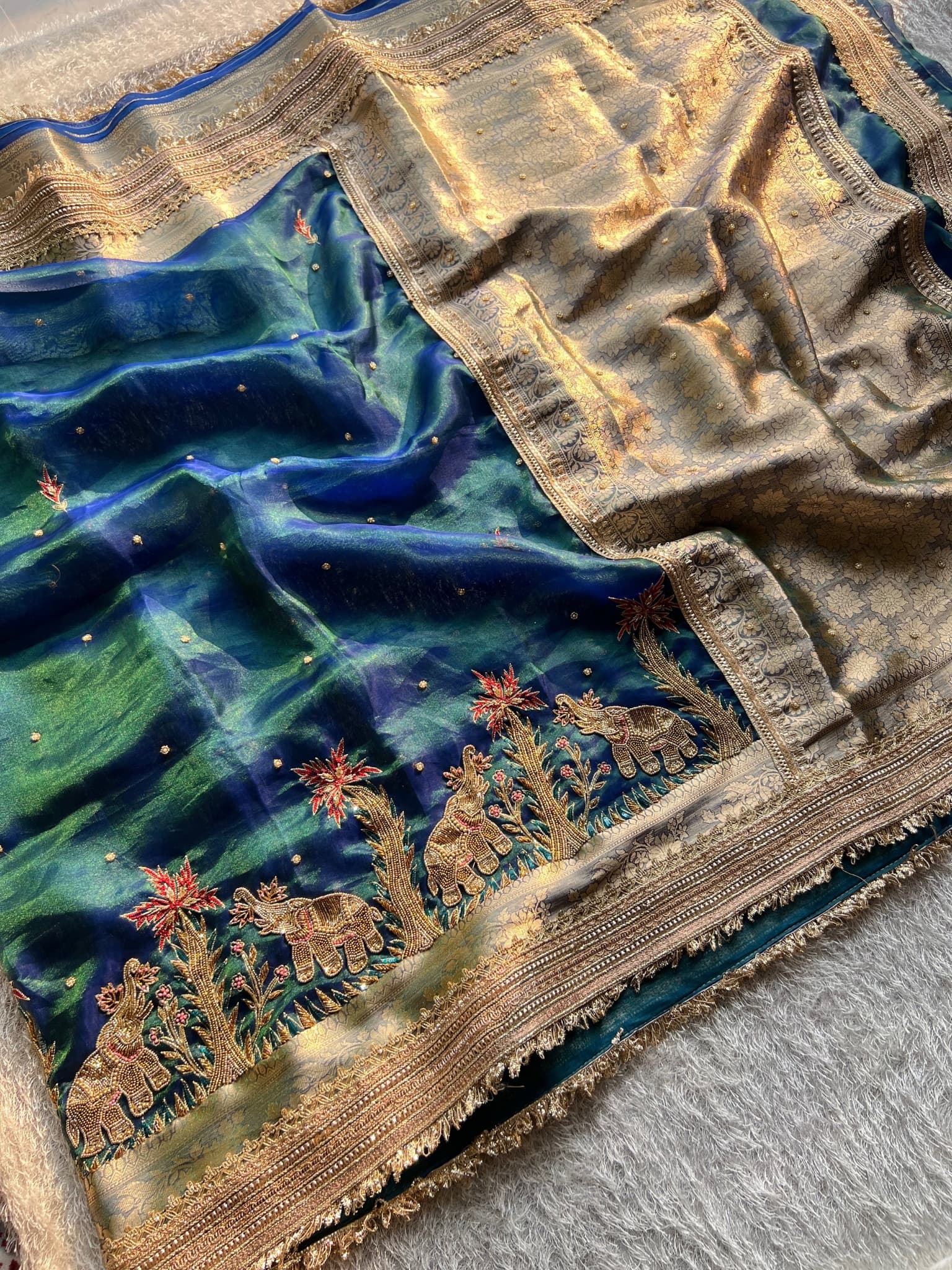 Hand-Embroidered Peacock teal blue Tissue Silk Saree with Elephant Motifs