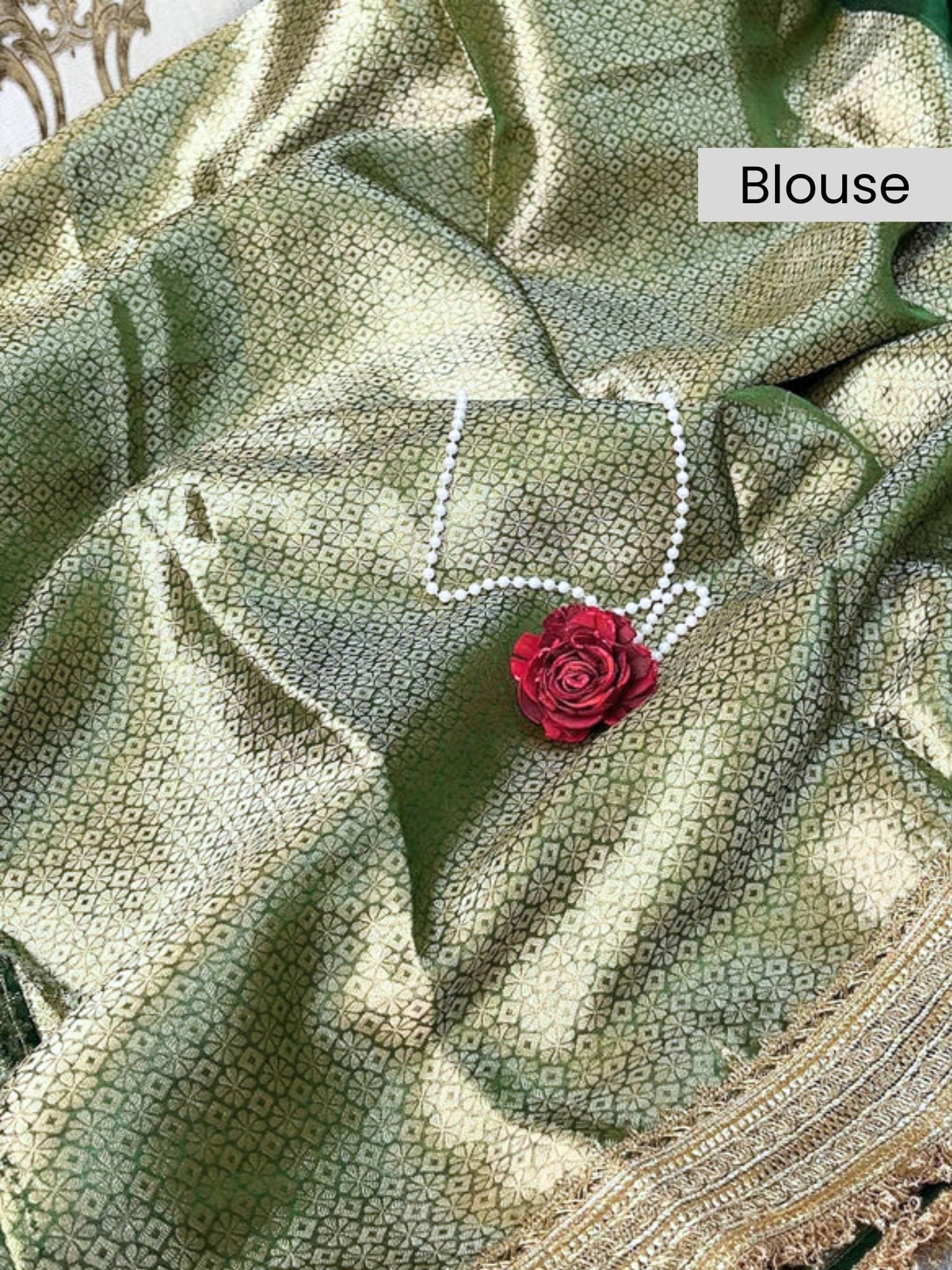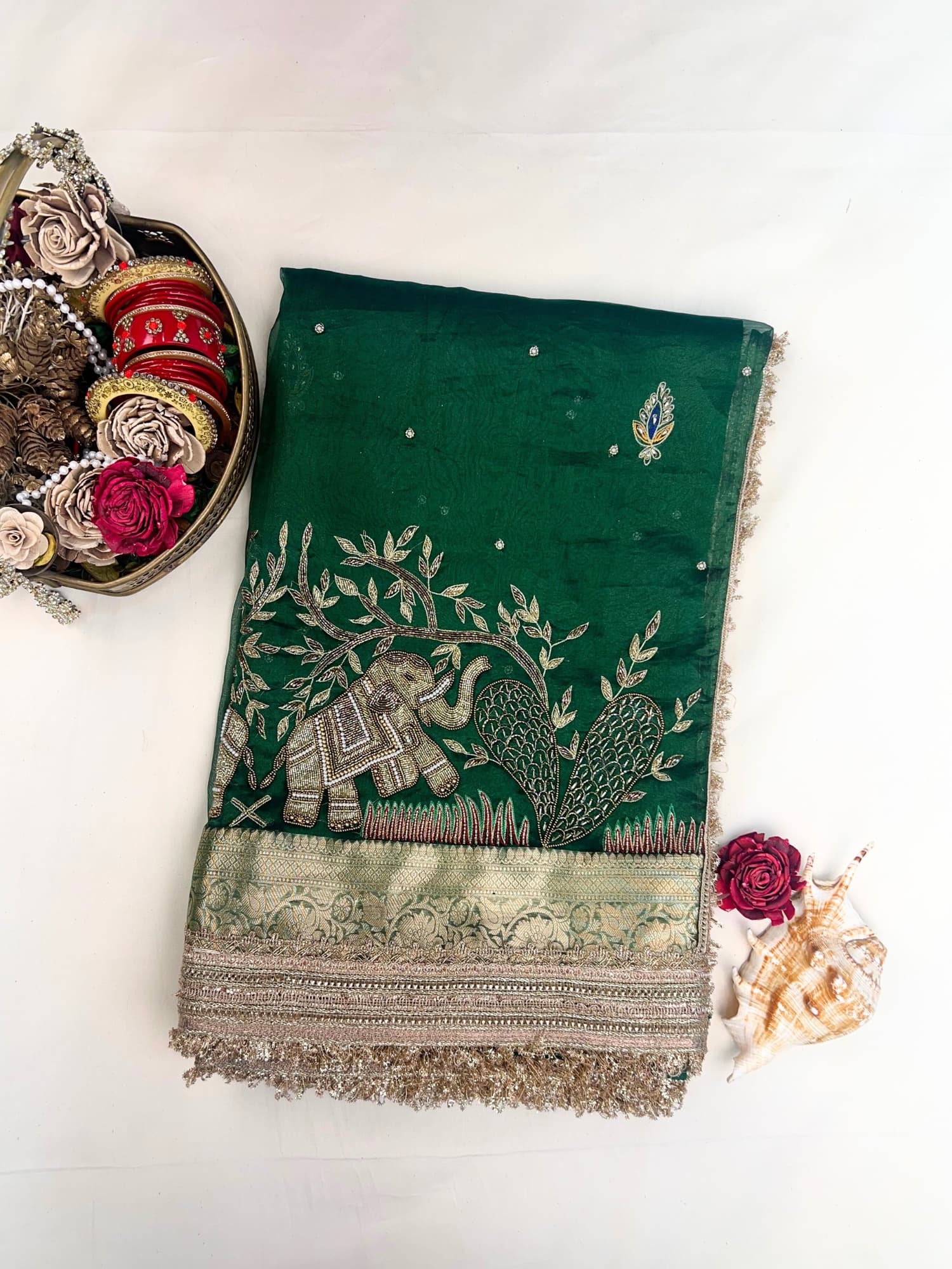 Embrace timeless elegance with this Green Tissue Silk Saree, crafted in Banaras and hand-embroidered with exquisite elephant motifs—symbols of strength, prosperity, and royalty. The shimmering tissue silk fabric with intricate gota patti borders makes it perfect for weddings, festivals, and celebrations. This Banarasi Green Tissue Silk Saree blends tradition with luxury, making you stand out with grace and regal charm. Ideal for those searching for the best green saree or tissue silk saree.