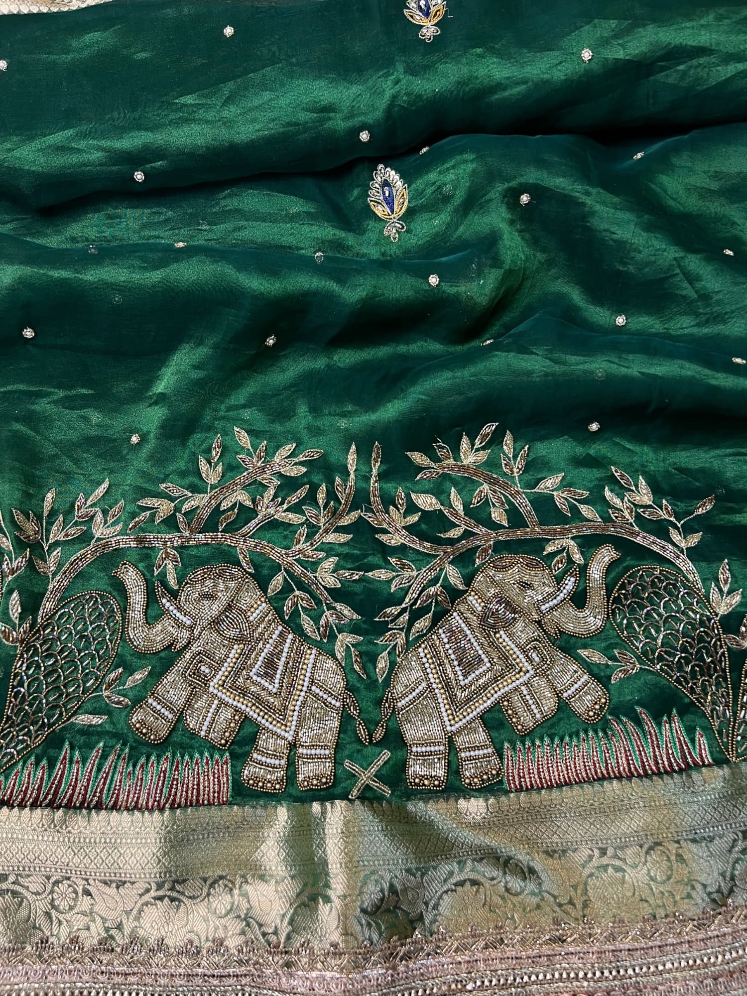 Hand-Embroidered Green Tissue Silk Saree with Elephant Motifs