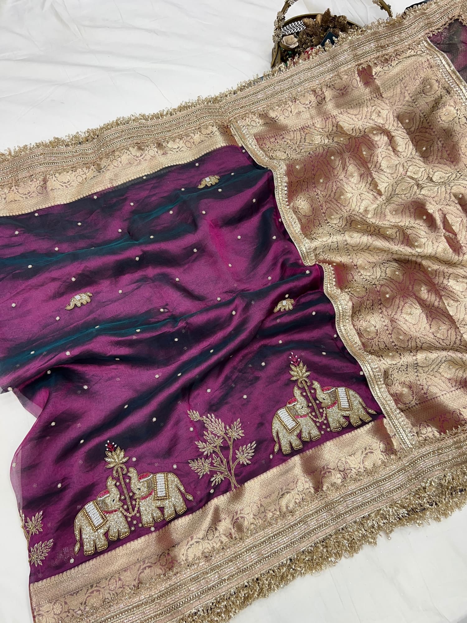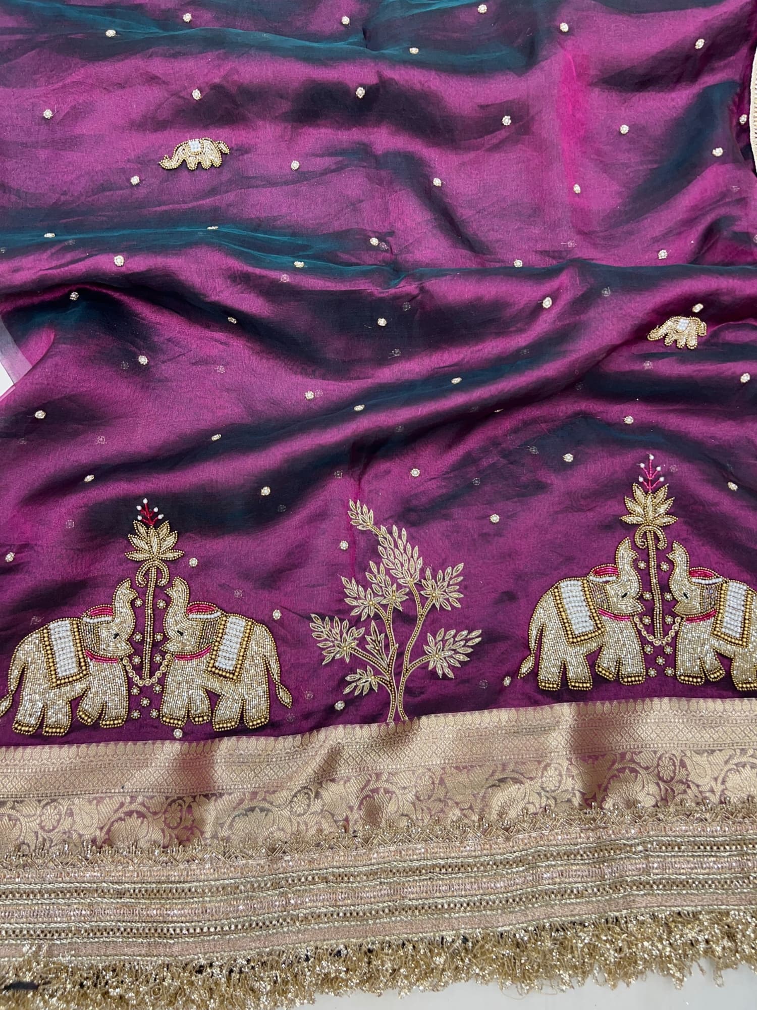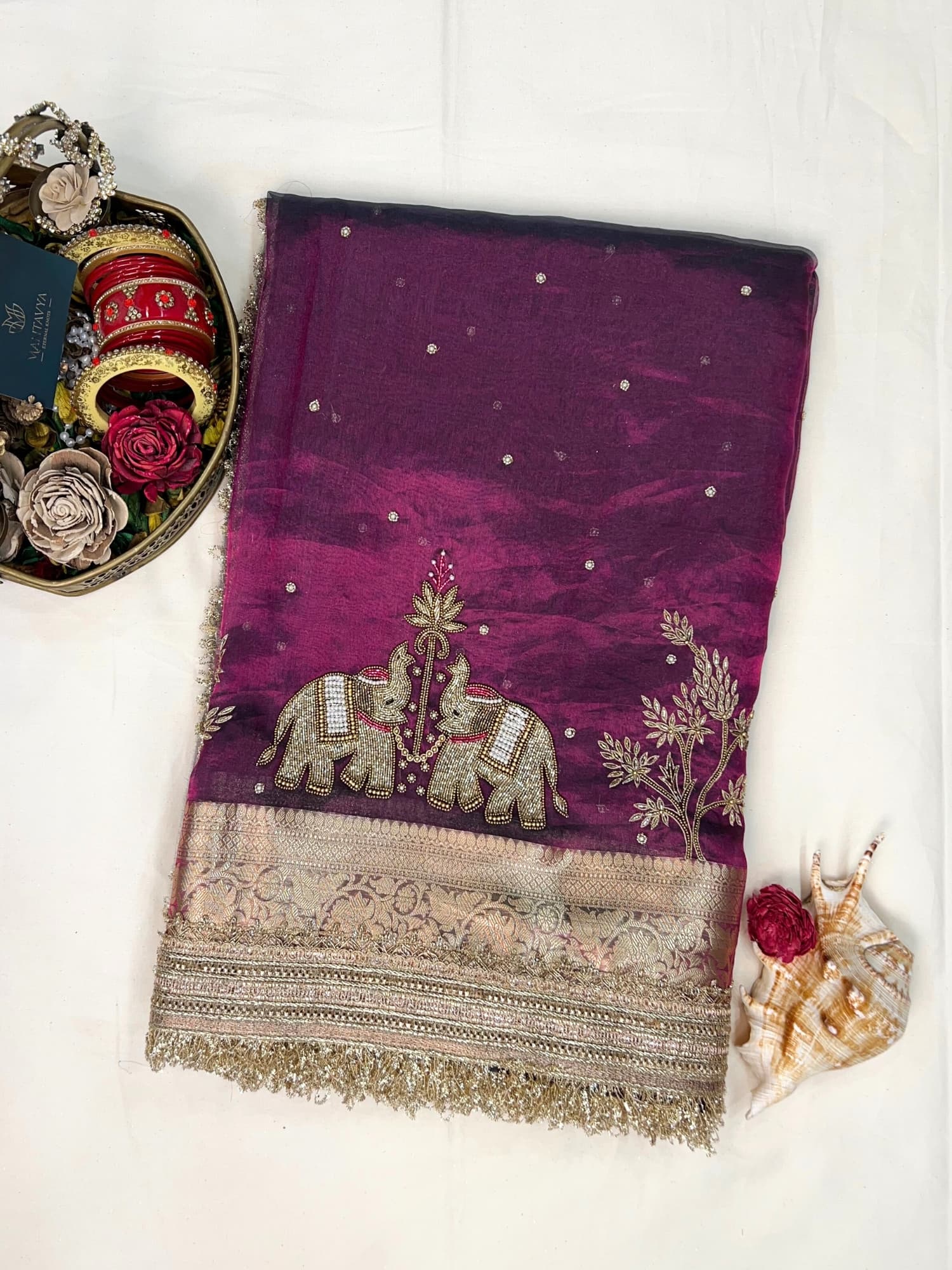 Hand Embroidered Wine Tissue Silk Saree with Elephant Motifs