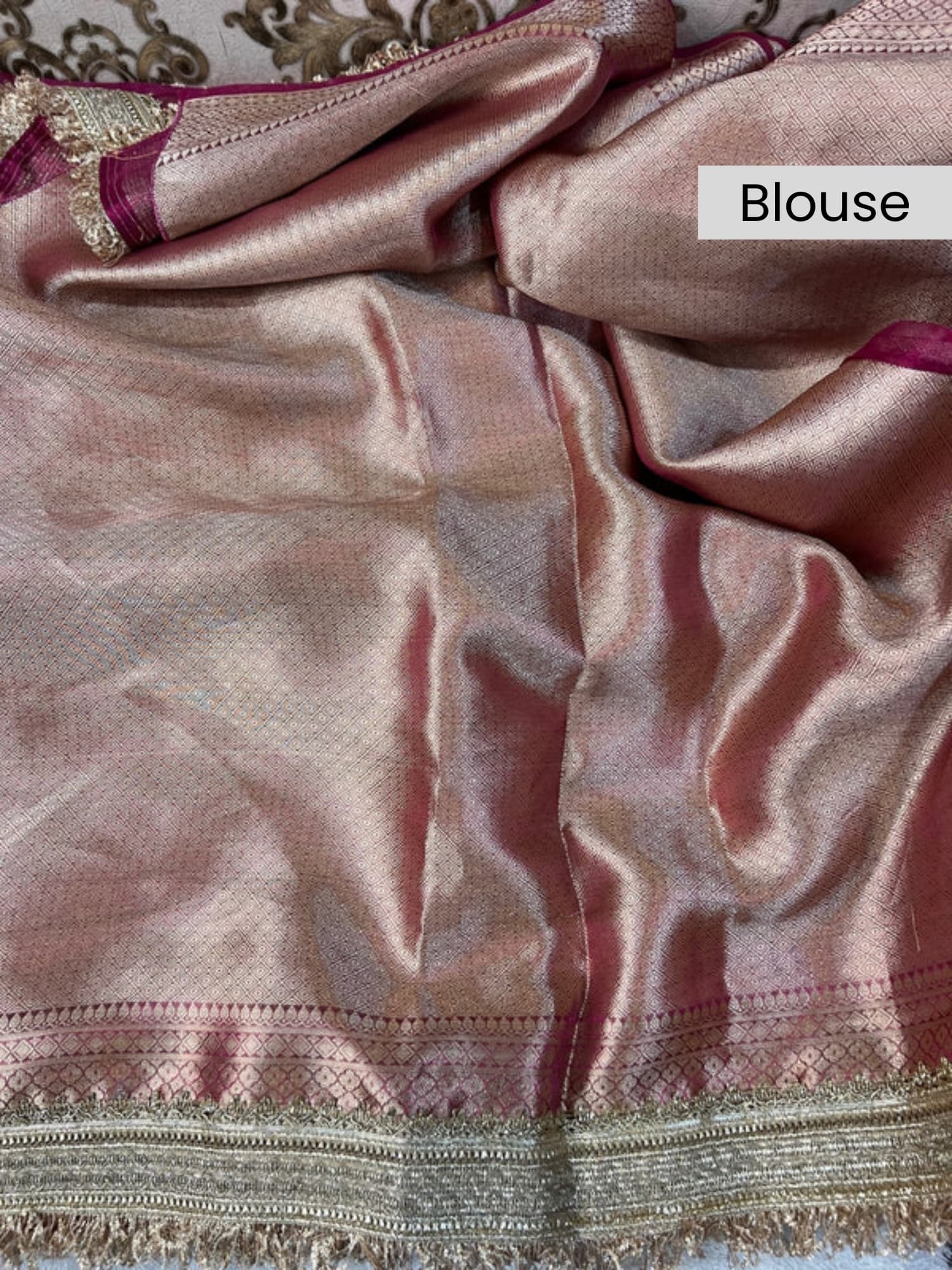 The Gajraaj saree in Wine tissue silk features exquisite hand embroidery with majestic elephant motifs. A radiant Banarasi drape that blends tradition with luxury, perfect for weddings, festive occasions, and cultural celebrations. Comes with an unstitched blouse.