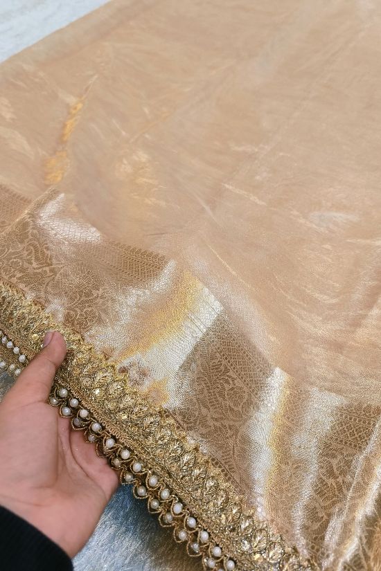 This Golden Pure Banarasi Tissue Silk Saree with Gota Patti Border offers a perfect blend of luxury and tradition. Its shimmering fabric and intricate detailing make it ideal for weddings and festive occasions.