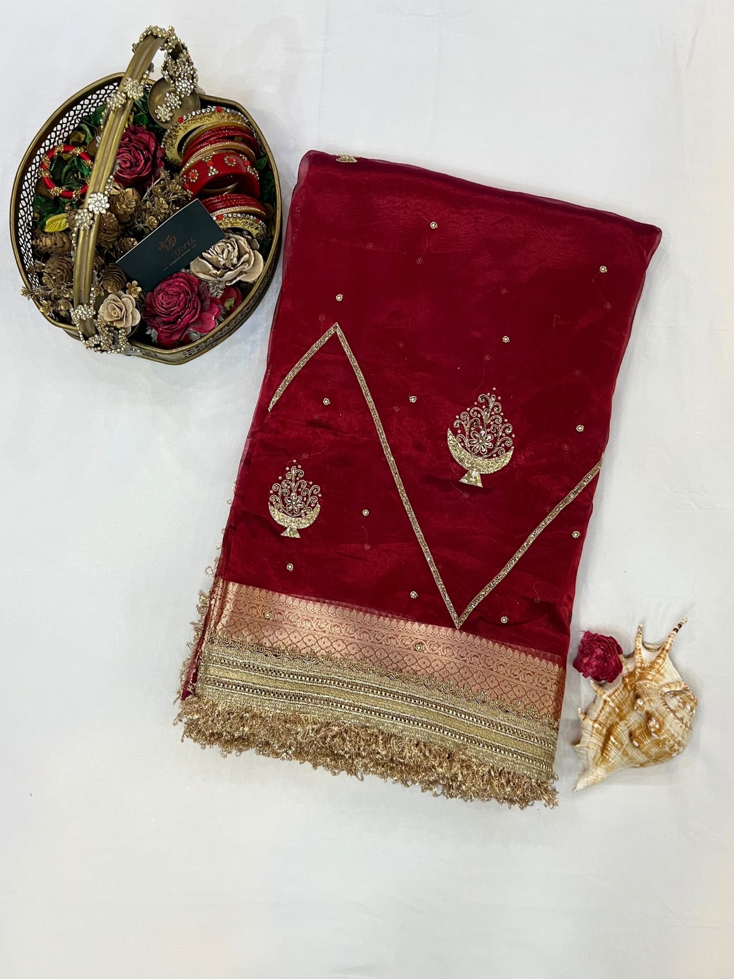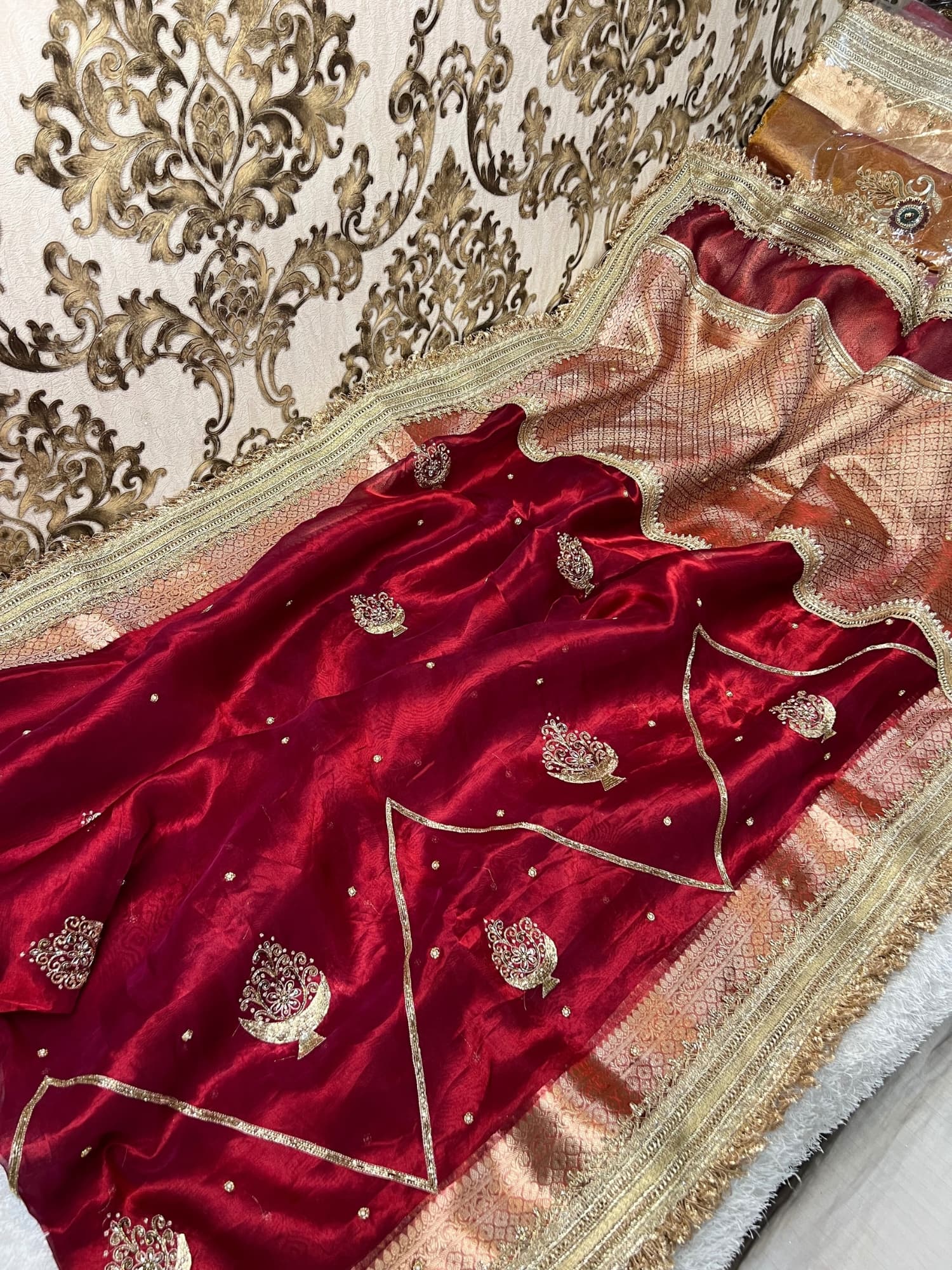 Hand Embroidered Red Guldasta Tissue Silk Saree