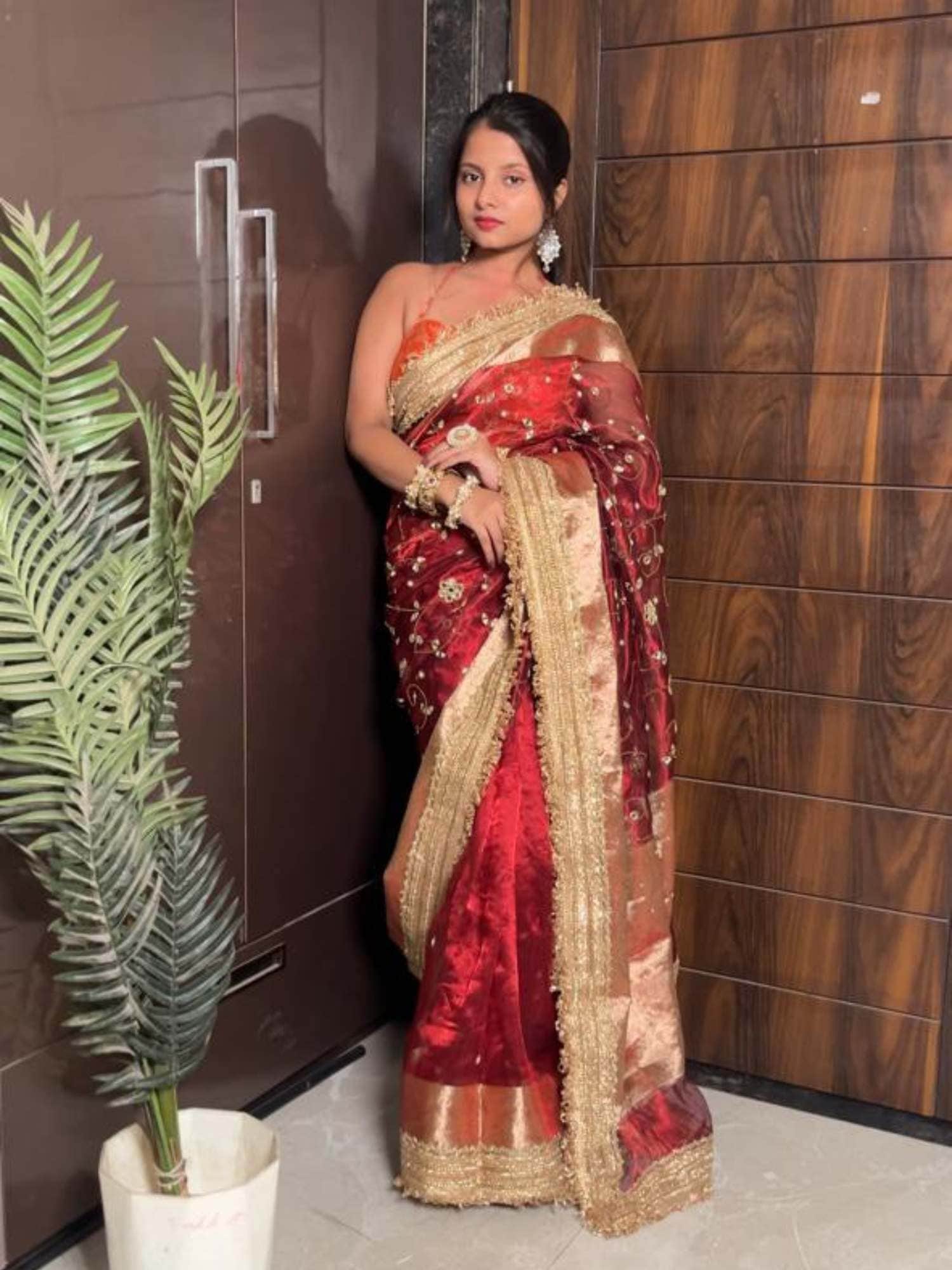 Hand-Embroidered Red Banarasi Tissue Silk Saree