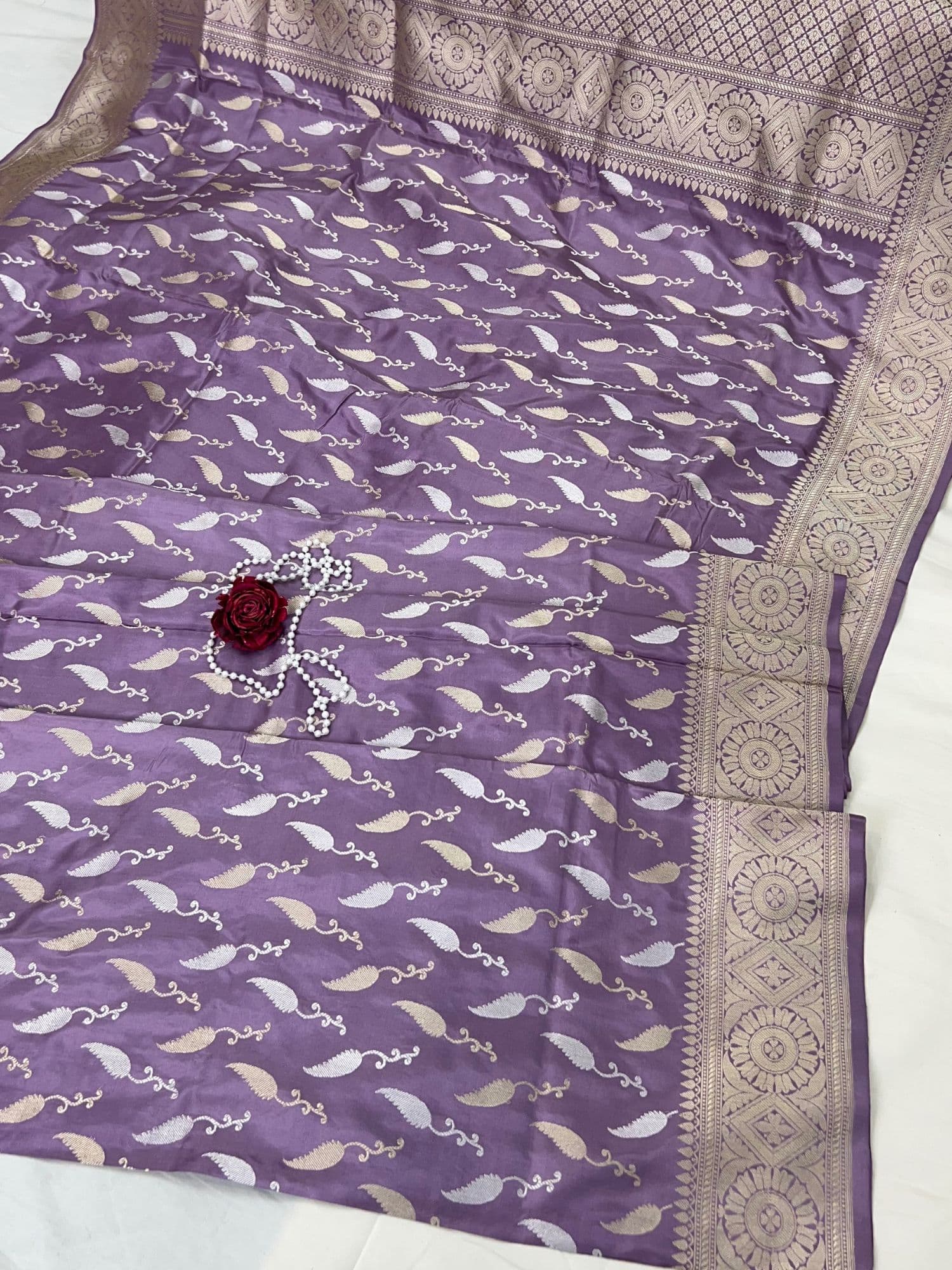Elegant handloom Pure Katan Silk Saree in a sophisticated lavender shade. The body is woven with continuous, stylized leaf (paan) buttis in a contrasting dual-tone zari (likely silver and gold/antique gold), featuring the classic All-Over Jall design. Finished with a magnificent, intricately patterned Banarasi border and pallu using the Kadiyal technique (contrasting border setting). Ideal for stylish occasions and contemporary silk lovers.