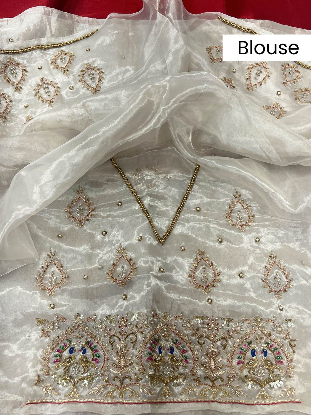 Laal Ishq is a stunning silver tissue silk saree crafted from premium diamond tissue silk and rooted in the richness of pure Banarasi tissue silk saree tradition. The highlight is its opulent hand-embroidered border featuring regal peacock motifs gracefully perched amidst intricate floral vines and zari paisley work. Each peacock is meticulously hand embroidered with fine detailing, adding royal charm and artistic depth. Lightweight, breathable, and easy to carry, this hand embroidered tissue silk saree offers effortless elegance. Elevate festive and wedding looks with the best tissue silk saree a true masterpiece of Banarasi craftsmanship.