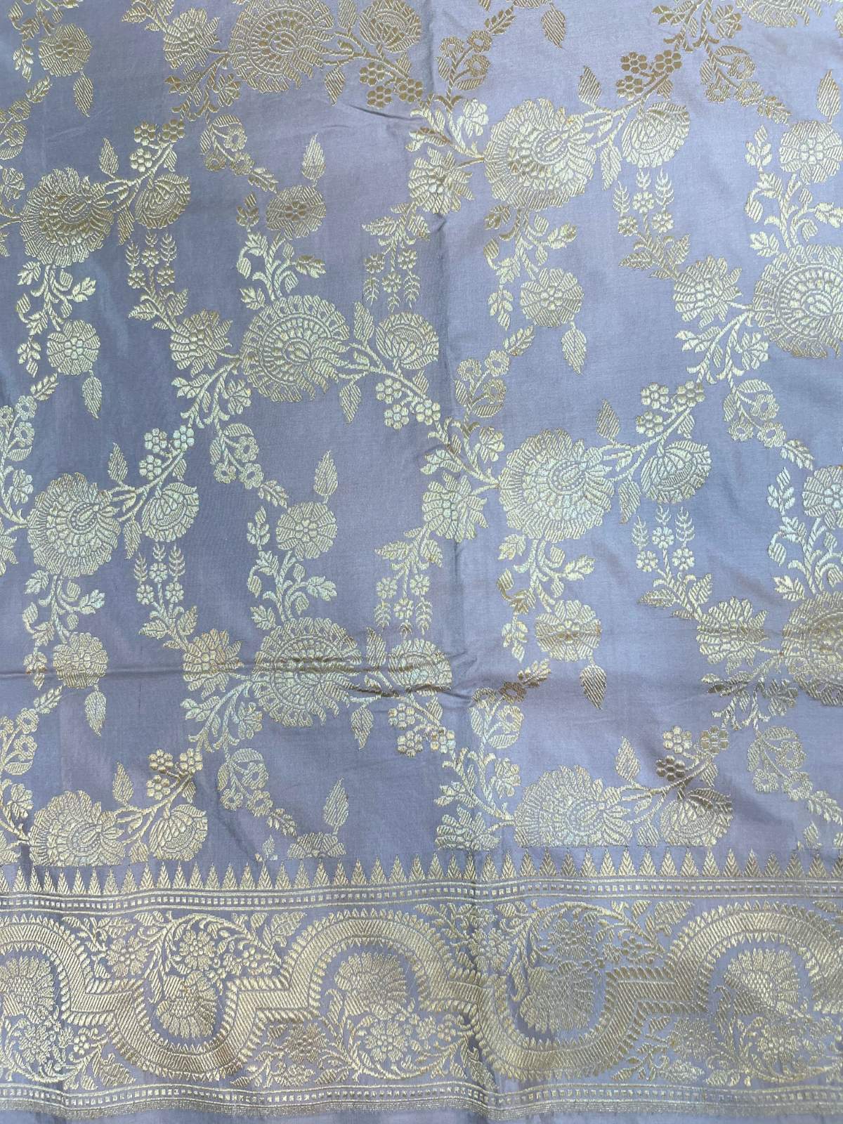 This pure Katan silk Banarasi saree is woven in an elegant light lavender hue, radiating soft sophistication and timeless charm. The lustrous silk body showcases an intricate all-over floral jaal crafted in antique gold zari, inspired by classic Banarasi artistry. Handwoven using tightly twisted Katan silk yarns, the saree offers a smooth texture, graceful drape, and natural sheen. The look is completed with a richly detailed zari border featuring traditional floral and architectural motifs, making it ideal for weddings, festive occasions, and refined celebrations.