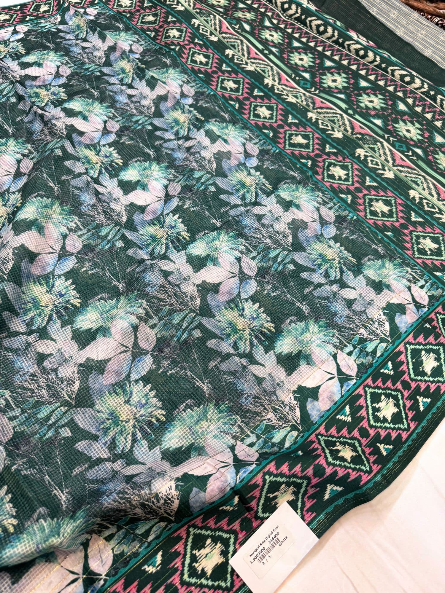This stunning silk fabric features a rich, dark base adorned with an exquisite, vibrant floral pattern in shades of teal, white, and hints of pink. The striking border showcases intricate geometric and traditional motifs, framed by a delicate teal piping, adding a touch of ethnic charm. This elegant piece is versatile and perfect for a range of occasions, from formal daytime events and festive gatherings to sophisticated evening wear, ensuring a standout look with its unique blend of contemporary and traditional design.