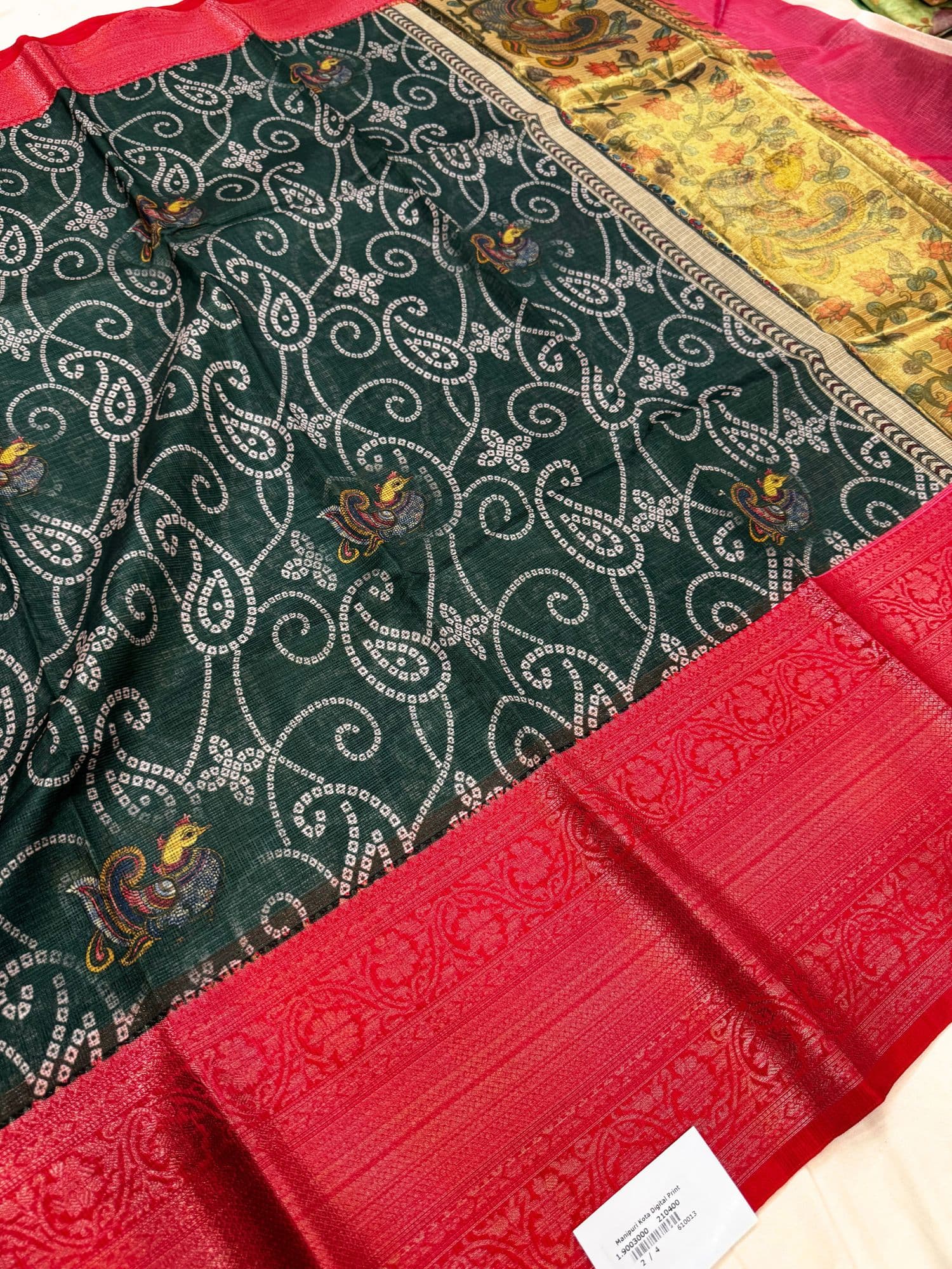 This Manipuri Kota Silk Saree with digital print blends lightweight comfort and rich elegance. Crafted in soft Kota silk, it features intricate paisley and floral motifs across the body and a contrasting Jacquard-style woven border that enhances traditional charm. The drape is airy yet luxurious, perfect for festive events, weddings, and ethnic celebrations. Its vibrant colours, smooth texture, and fine craftsmanship make it a timeless wardrobe addition and an ideal choice for gifting.