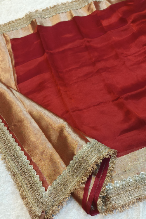 This Maroon Pure Banarasi Tissue Silk Saree with Gota Patti Border features rich, deep color and exquisite craftsmanship. Perfect for weddings, festivals, and special occasions, it adds elegance to any celebration.