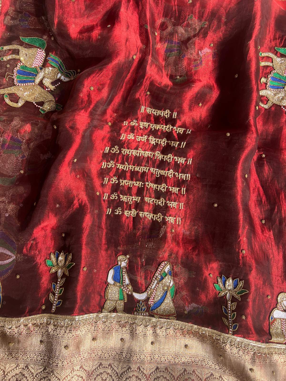 Celebrate your new beginnings with this Maroon Banarasi Tissue Silk Saree, artistically adorned with a detailed baarat scene featuring a groom on horseback symbolizing love, joy, and the sacred Saat Vachan. Perfect for new brides, this luxurious tissue silk saree shines with a royal golden glow, making it ideal for wedding pheras, rituals, and bridal photoshoots a perfect blend of tradition and timeless elegance.