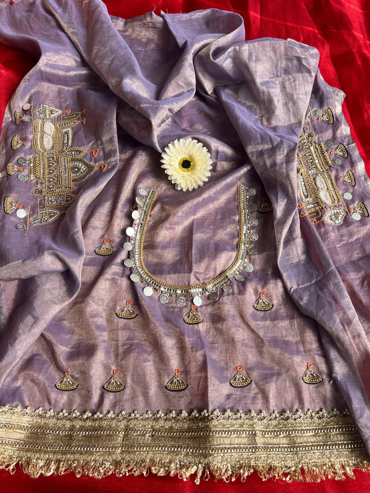 Presenting the Jadau Banarasi Ghat Saree, a regal creation crafted from 100% pure Banarasi tissue silk in a rich Metallic Lavender color. This best saree showcases luxurious Banarasi silk with a luminous tissue silk finish. The highlight is the hand-embroidered border, featuring intricate Banarasi Ghat motifs enhanced with detailed katdana work and dabka work, reflecting exquisite craftsmanship. Lightweight yet opulent, it drapes beautifully for weddings, festive occasions, and traditional ceremonies. This Banarasi tissue silk saree embodies heritage artistry, royal elegance, and timeless sophistication.