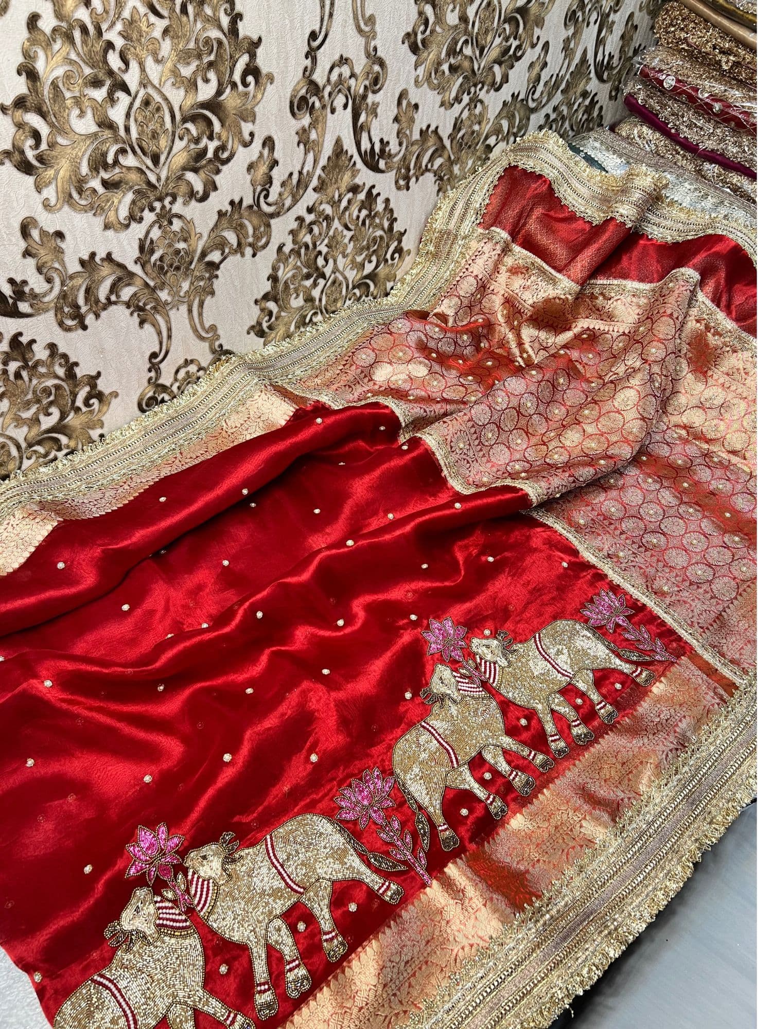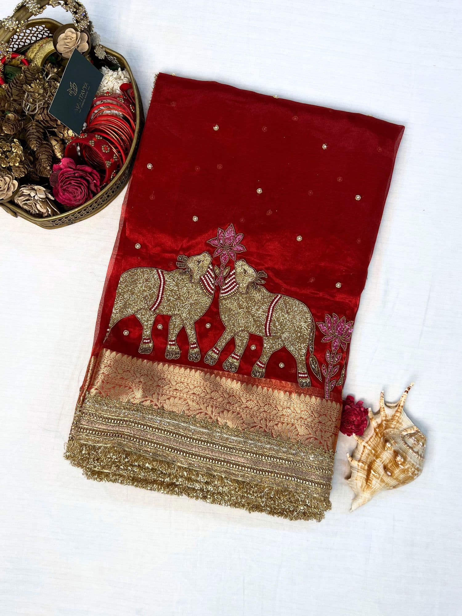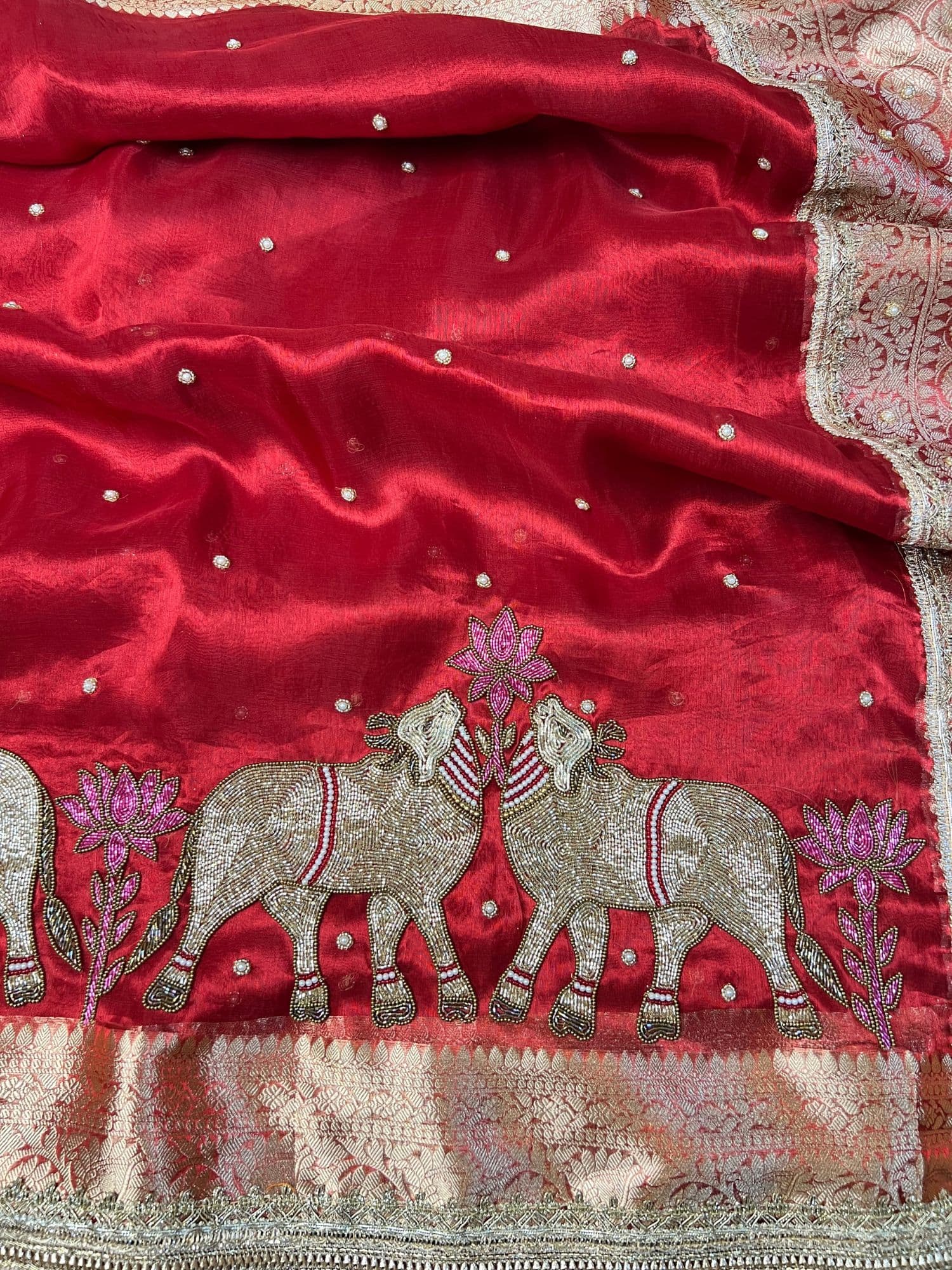 Red Hand Embroidered Banarasi Tissue Silk Saree
