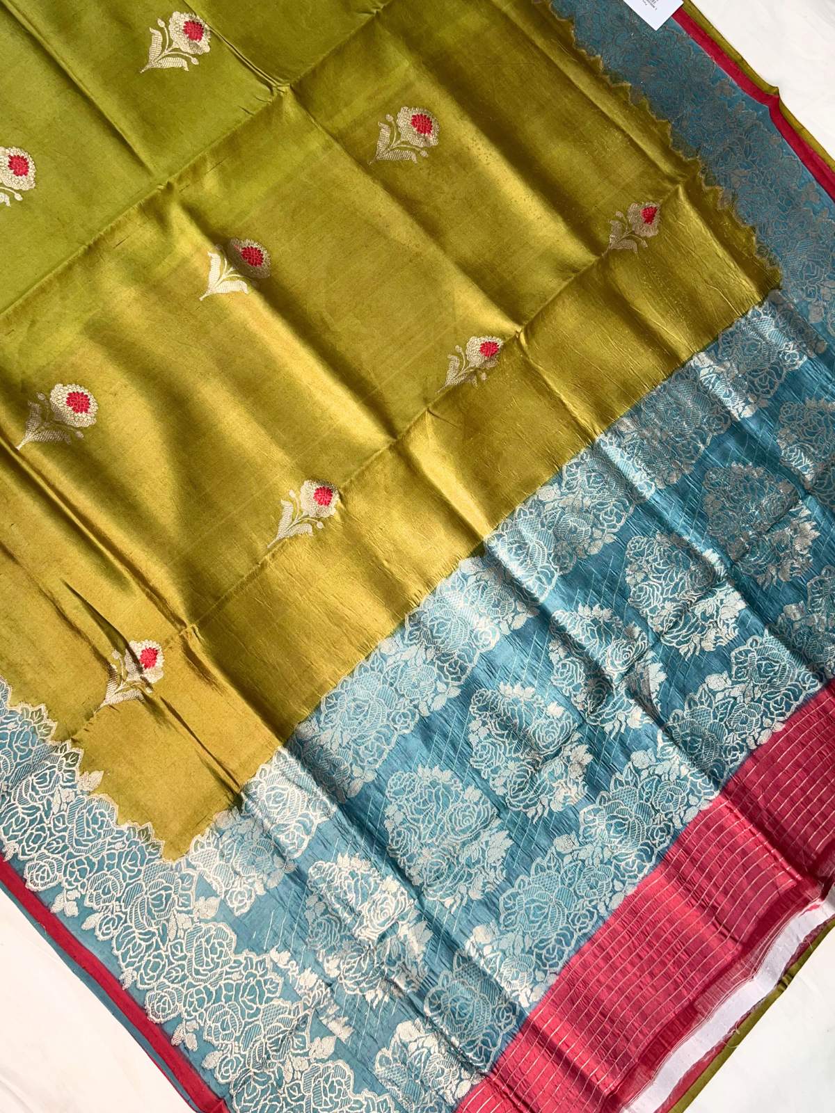 This pure Katan silk Banarasi saree is woven in an elegant olive green hue, reflecting understated luxury and refined taste. The smooth, lustrous silk body is adorned with delicate floral buttas, highlighted with subtle Meenakari accents that add gentle contrast and charm. Crafted using traditional handloom techniques, the tightly twisted Katan silk ensures durability, natural sheen, and a graceful drape. The saree is finished with a striking contrasting blue zari border featuring intricate floral brocade work, complemented by a fine maroon edge—perfect for festive occasions and sophisticated celebrations.