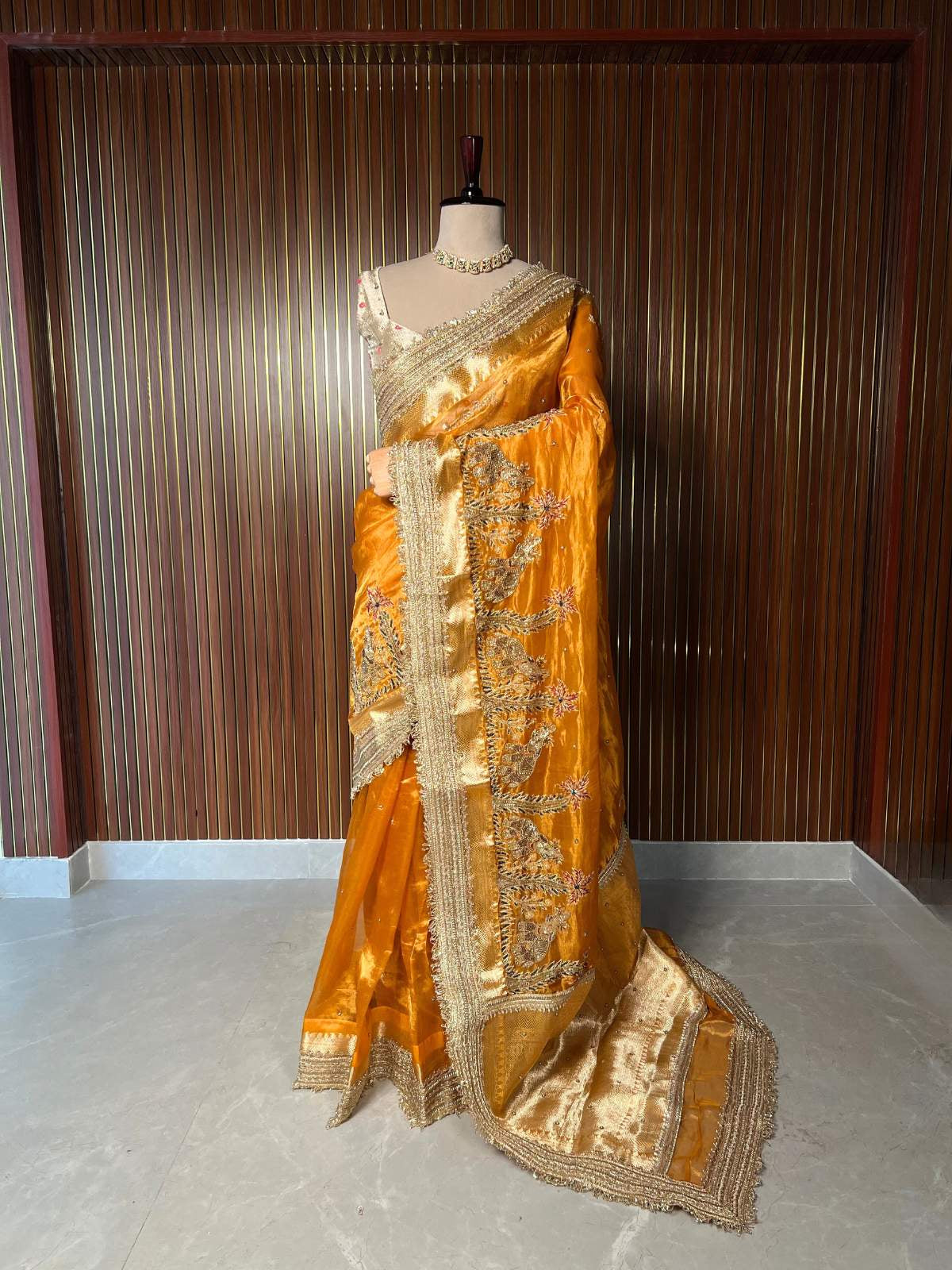 Hand-Embroidered Orange Tissue Silk Saree with Elephant Motifs