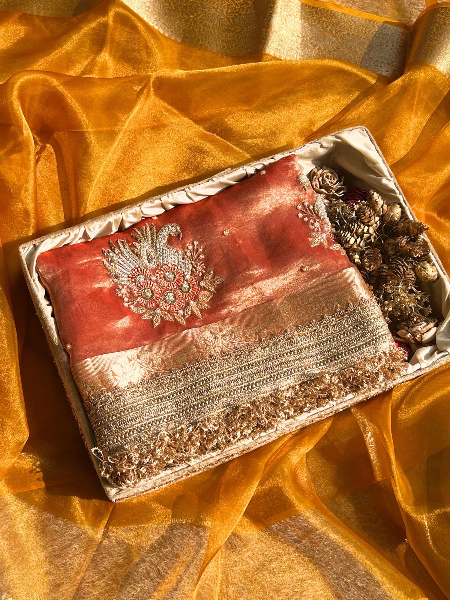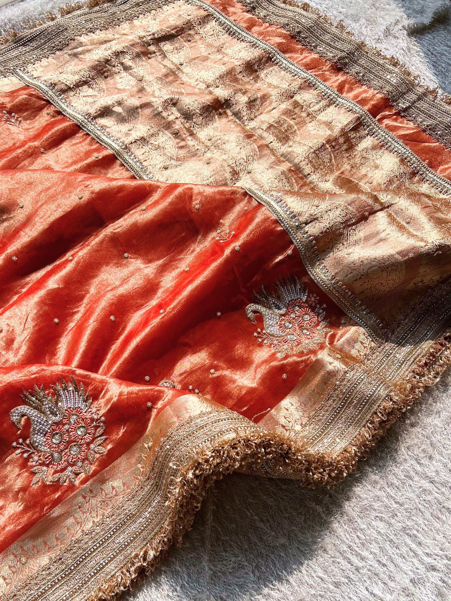 This Pastel Orange Banarasi tissue silk saree features a delicate white swan motif, intricate silver floral embroidery, and a graceful gota patti lace border. Paired with an unstitched brocade blouse, it’s a timeless piece perfect for weddings, receptions, and festive occasions. This Pastel Orange Banarasi tissue silk saree features a delicate white swan motif, intricate silver floral embroidery, and a graceful gota patti lace border. Paired with an unstitched brocade blouse, it’s a timeless piece perfect for weddings, receptions, and festive occasions.