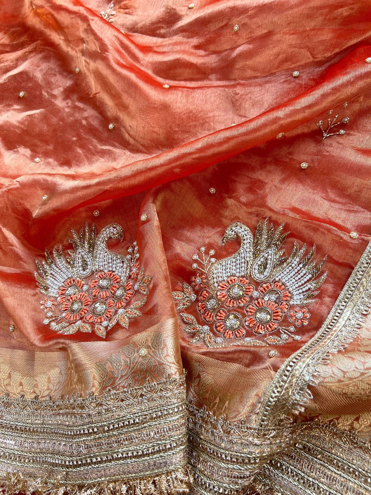 Pastel Orange Swan Motif Banarasi Tissue Silk Saree