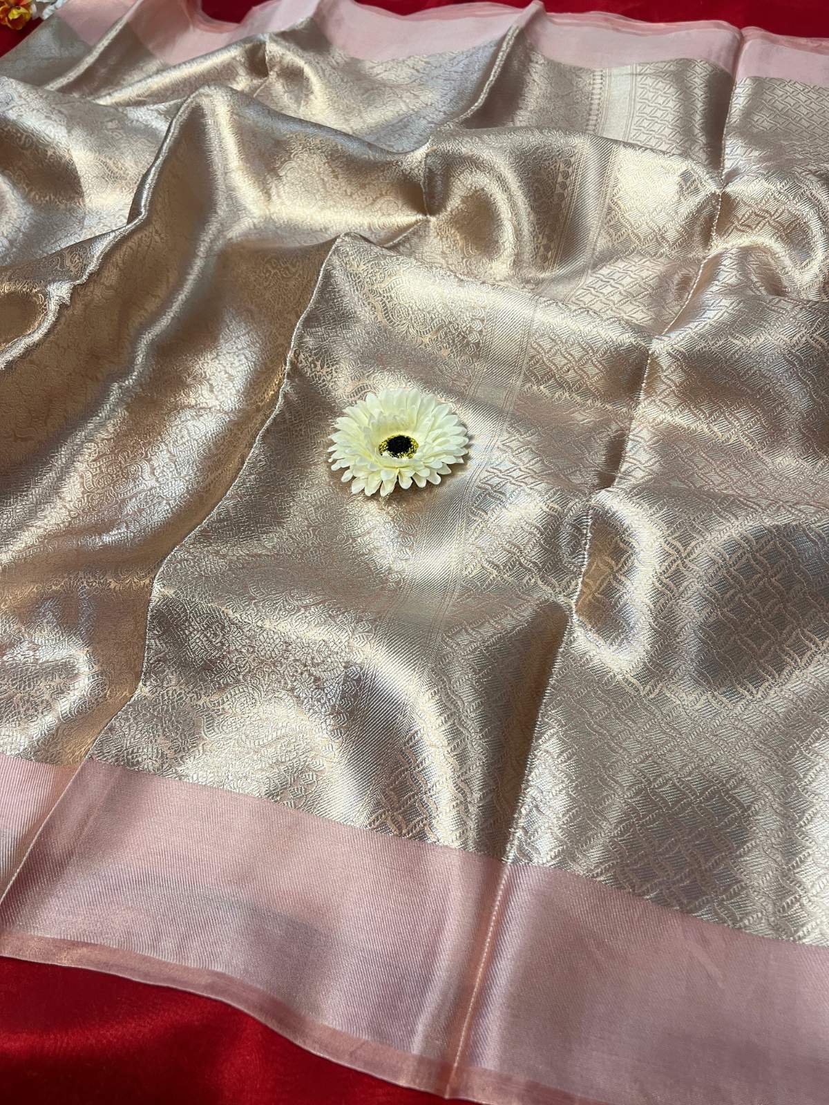 Elevate your festive wardrobe with this luxurious brocade tissue silk saree crafted from premium quality tissue fabric. The shimmering gold body features intricate woven floral and geometric motifs that create a rich textured finish. Its elegant pastel Pink border with subtle zari detailing adds a graceful contrast, enhancing the saree’s royal appeal. Lightweight yet grand, this saree drapes beautifully, making it perfect for weddings, receptions, and traditional celebrations. Experience timeless sophistication with this best tissue silk saree for special occasions.