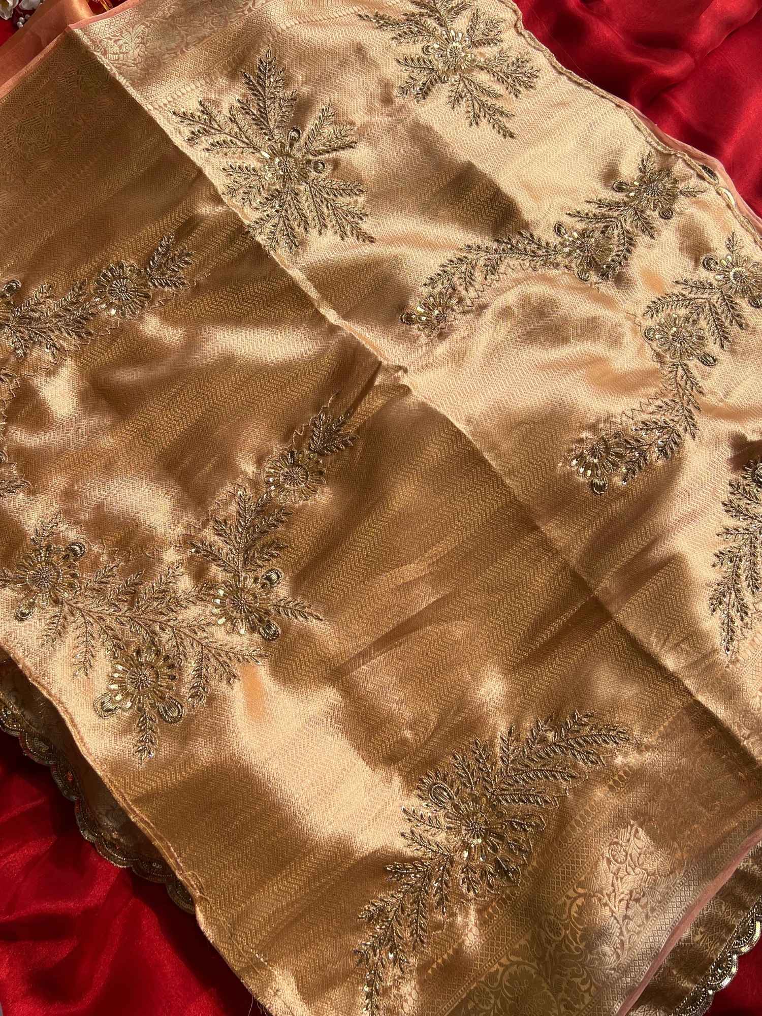 Introducing the Rani Saree, an elegant creation crafted from 100% pure Banarasi tissue silk in a soft peach-gold color. This best saree showcases the richness of Banarasi silk with a subtle tissue silk sheen that feels lightweight and luxurious. The highlight of this saree is its beautiful hand embroidery on the border, adding a refined and graceful finish. Simple yet sophisticated, it drapes effortlessly, making it ideal for weddings, festive occasions, receptions, and traditional functions. The Alia Banarasi tissue silk saree reflects timeless beauty, fine craftsmanship, and classic Indian elegance.