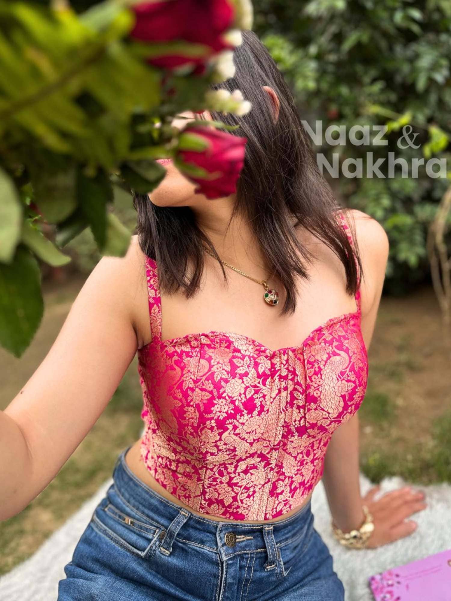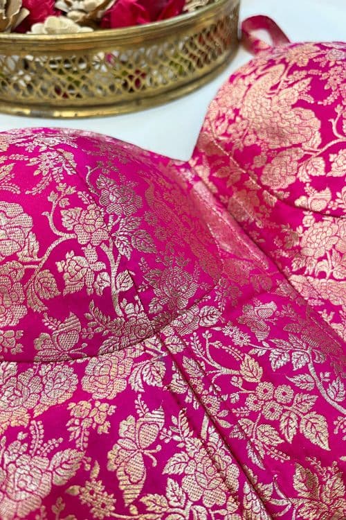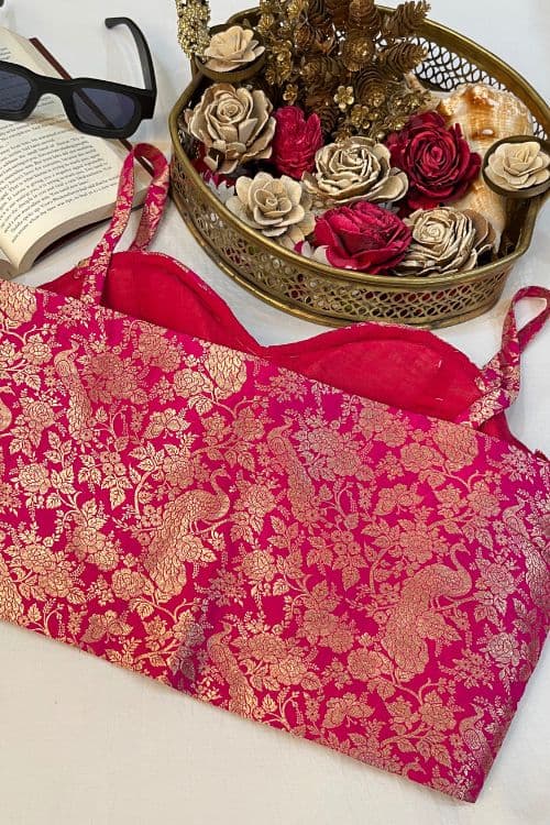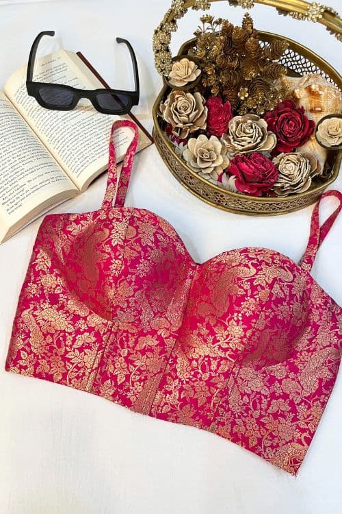 From our Naaz & Nakhra collection – this Banarasi Brocade Corset is the perfect blend of tradition and style. Crafted with boning for a structured fit, padded cups for comfort, and a side zipper for easy wear, it beautifully shapes your silhouette. Adorned with rich Gold Zari and intricate motifs, it’s a regal standout for any special occasion.
