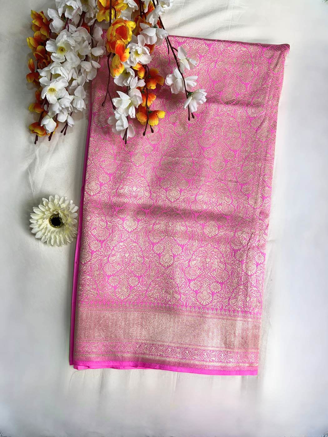 This best katan silk saree in radiant pink reflects timeless Banarasi grandeur with an opulent festive appeal. The body is richly adorned with intricate floral jaal motifs woven in fine zari, creating a seamless tapestry of blooming patterns that symbolize elegance and prosperity. The luminous pink base enhances the brilliance of the detailed weaving, giving the saree a regal glow. The border features elaborate geometric and floral zari artistry, adding structure and traditional depth to the design. The anchal (pallu) carries dense, coordinated zari work for a luxurious and majestic finish. Crafted from pure katan silk, this best Banarasi silk saree offers a smooth drape and radiant sheen—truly the best katan silk saree for weddings and grand celebrations.