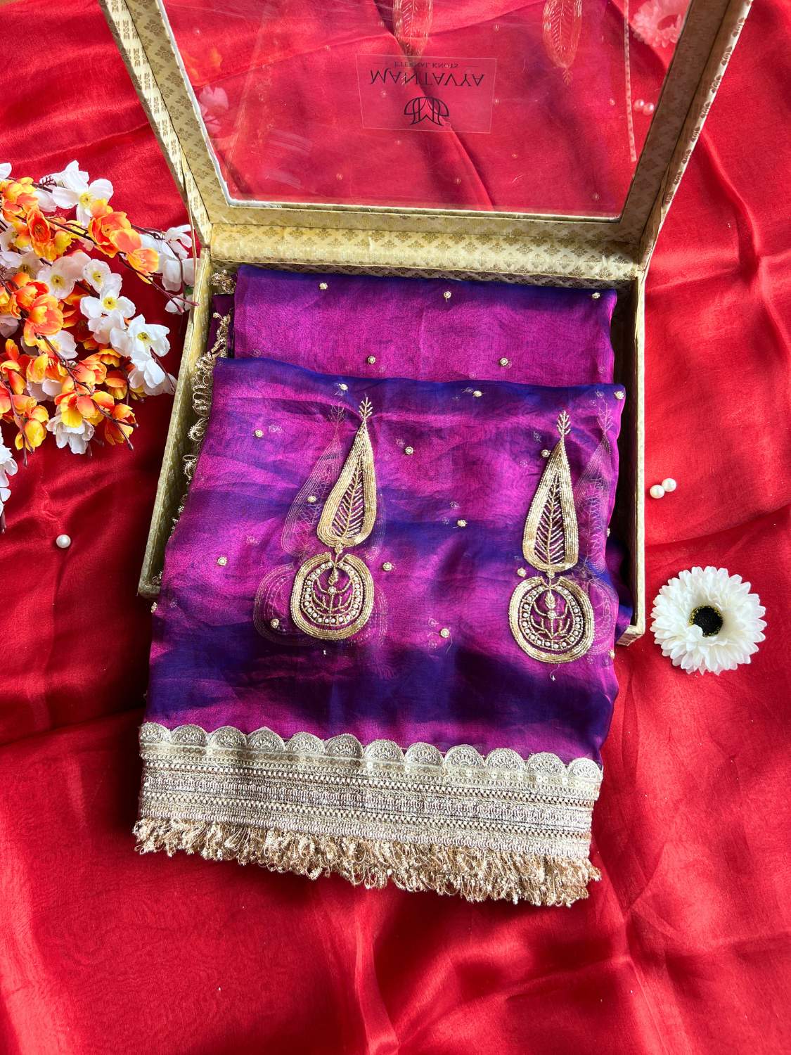 Make a bold royal statement with this pure tissue silk saree in a rich royal purple hue, crafted to exude festive sophistication. The saree body is adorned with delicate scattered zari butis that add a subtle shimmer, while the highlight is the beautifully hand-embroidered paisley and leaf drop motifs along the lower panel, inspired by classic Banarasi artistry. The elegant scalloped zari border enhances its regal appeal, and the finely finished anchal drapes with graceful fluidity. A refined choice for those who appreciate the best tissue silk saree and the timeless charm of best Banarasi silk craftsmanship.