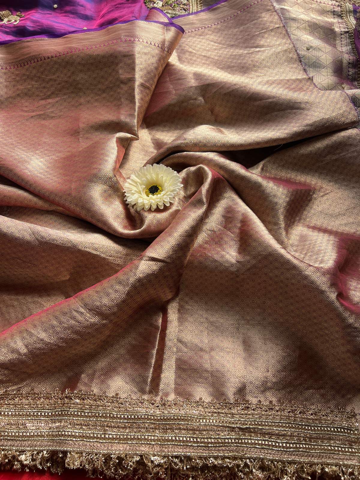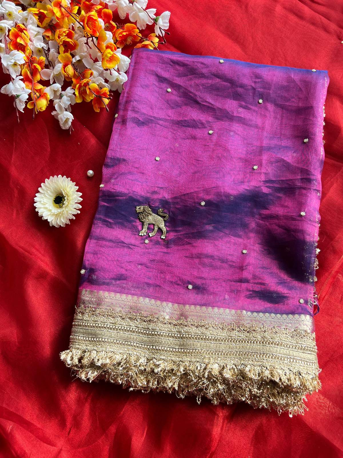 Introducing the Sherbagh Saree, a regal masterpiece crafted from 100% pure Banarasi tissue silk in a stunning blend of royal purple and magenta hues. This best saree showcases the richness of Banarasi silk with a luminous tissue silk sheen and delicate all-over buti detailing. The highlight is the majestic lion (Sher) motif intricately worked along the border, symbolizing power and elegance. Finished with a finely woven zari border, this Banarasi tissue silk saree drapes beautifully, making it perfect for weddings, festive occasions, and grand traditional celebrations.