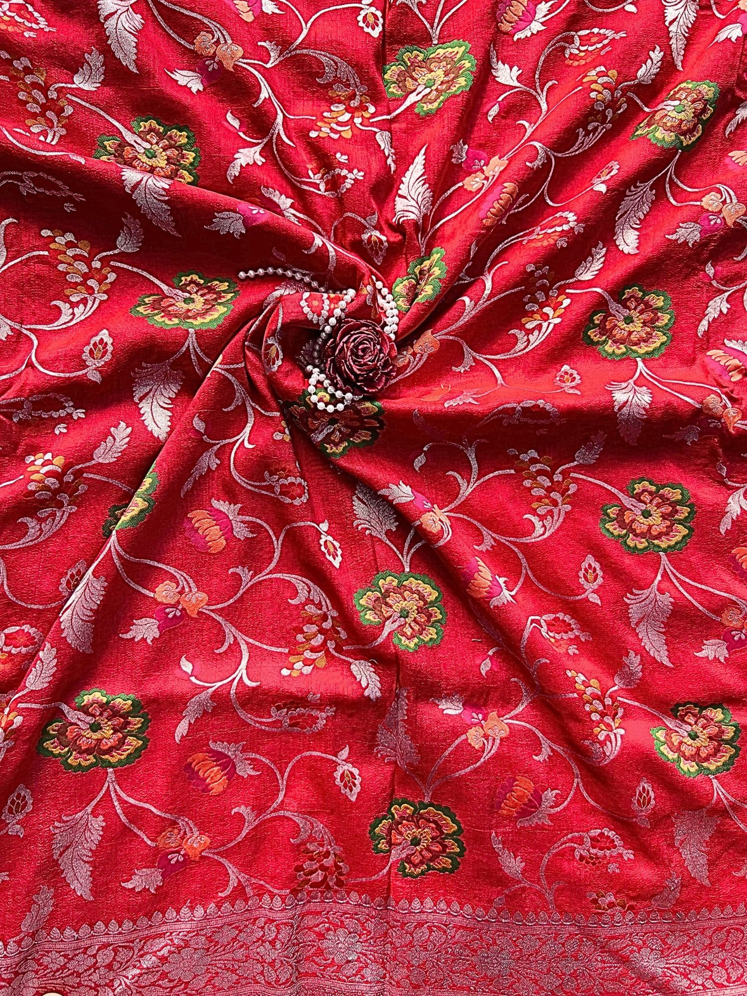 This stunning Moonga silk saree features a rich red base beautifully adorned with intricate multicolored floral weaving. The detailed border and artistic pallu highlight traditional craftsmanship, giving the saree a luxurious and festive appeal. Its smooth, lustrous texture and elegant patterns make it ideal for weddings, celebrations, and cultural events. Perfect for women who appreciate classic elegance, this saree blends vibrant colors with timeless artistry, offering a graceful and sophisticated look for any special occasion.