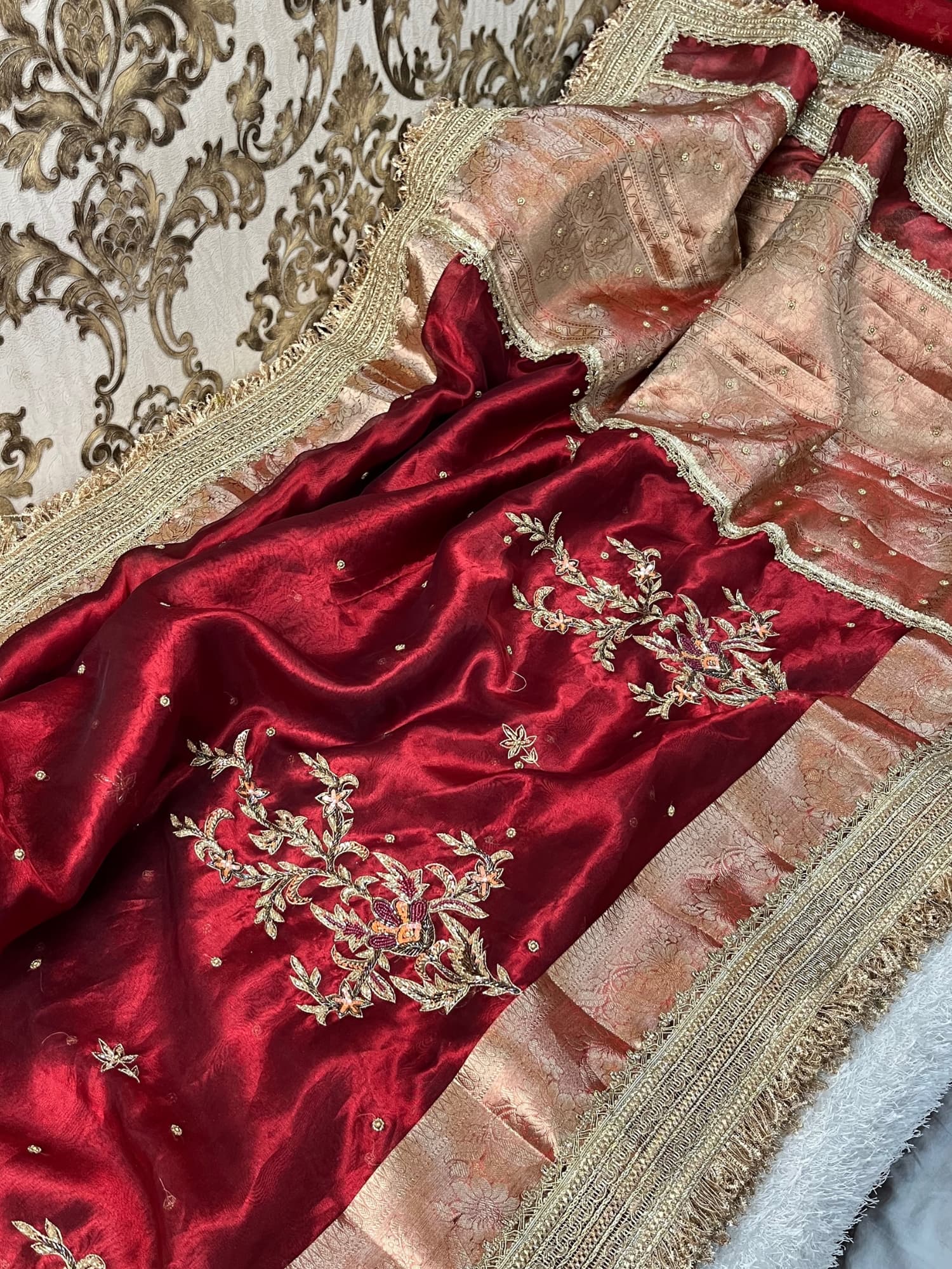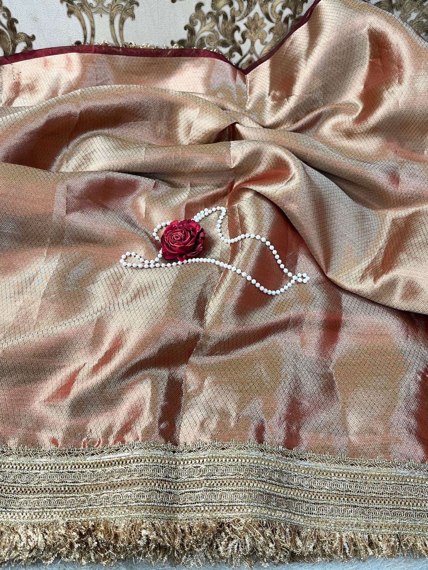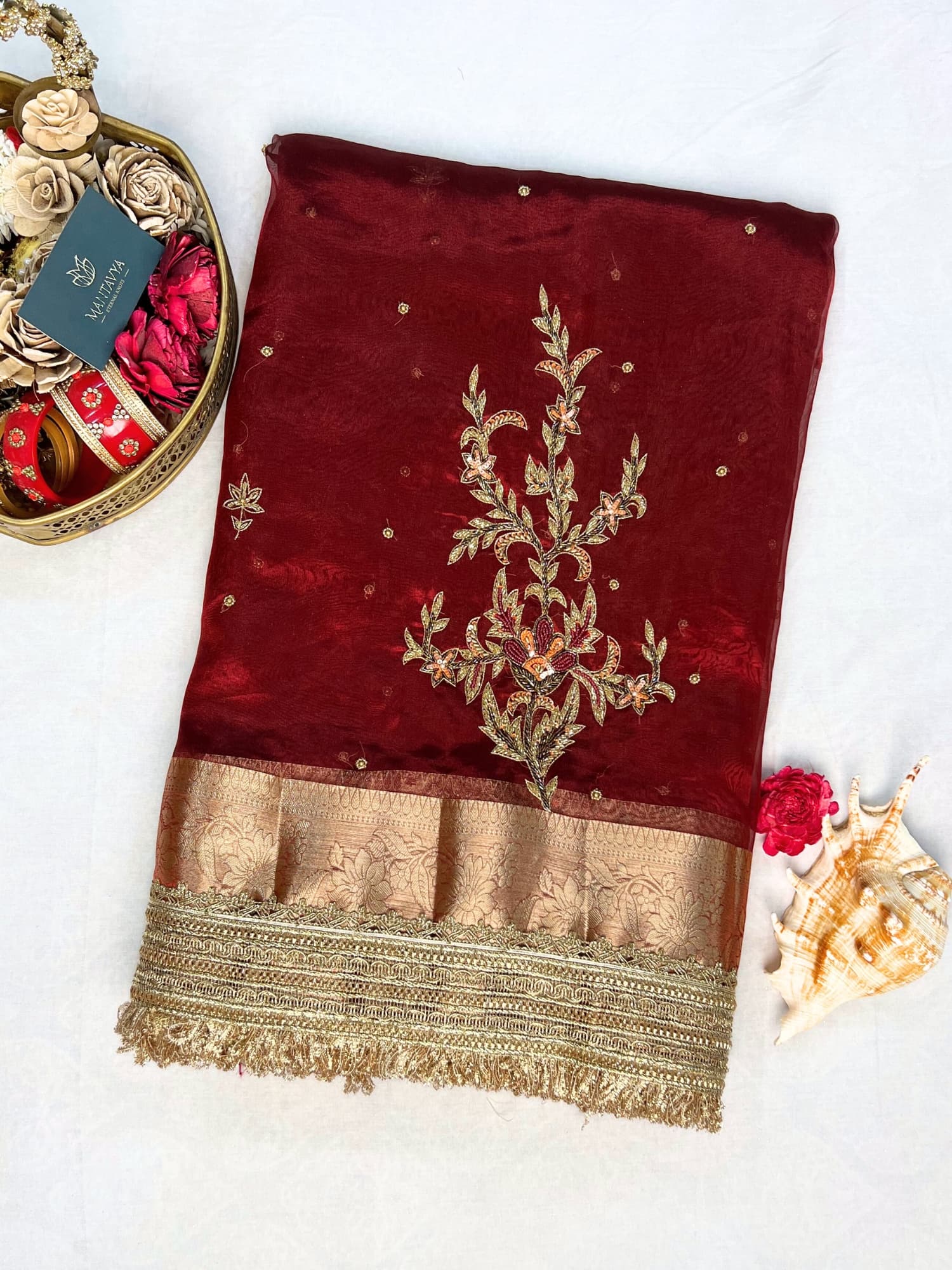 Sanjivani by Mantavya Banaras is a masterpiece in maroon Banarasi tissue silk, blending royal elegance with timeless craftsmanship. The lustrous maroon drape, adorned with intricate zari work, makes it perfect for weddings, festive occasions, and grand celebrations. A symbol of tradition and luxury, Sanjivani is designed for women who want to shine with regal grace. Elevate your wardrobe with this heritage treasure – Shop Now.