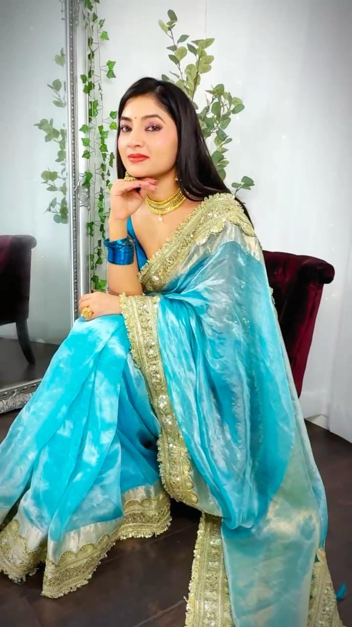 This blue Pure Banarasi tissue silk saree features exquisite gota patti embroidery, adding a touch of elegance and tradition. Perfect for weddings, festivals, and special occasions, the soft silk fabric drapes beautifully, offering comfort and style. The intricate detailing enhances its timeless charm, making it an ideal choice for those seeking a blend of sophistication and cultural heritage.