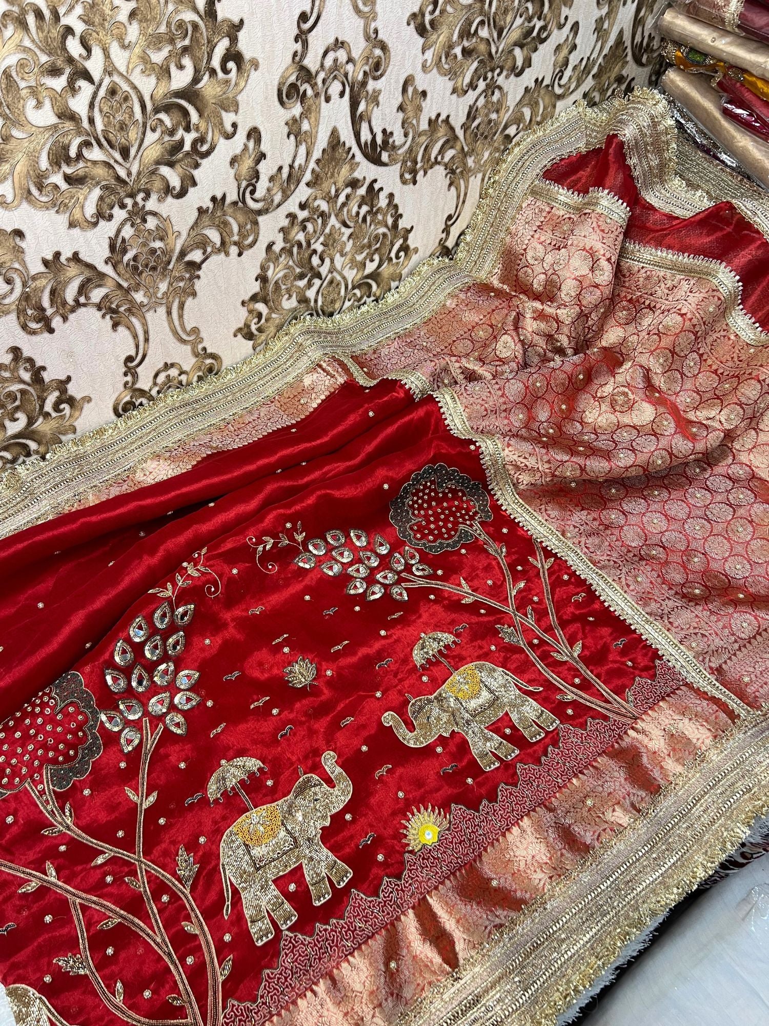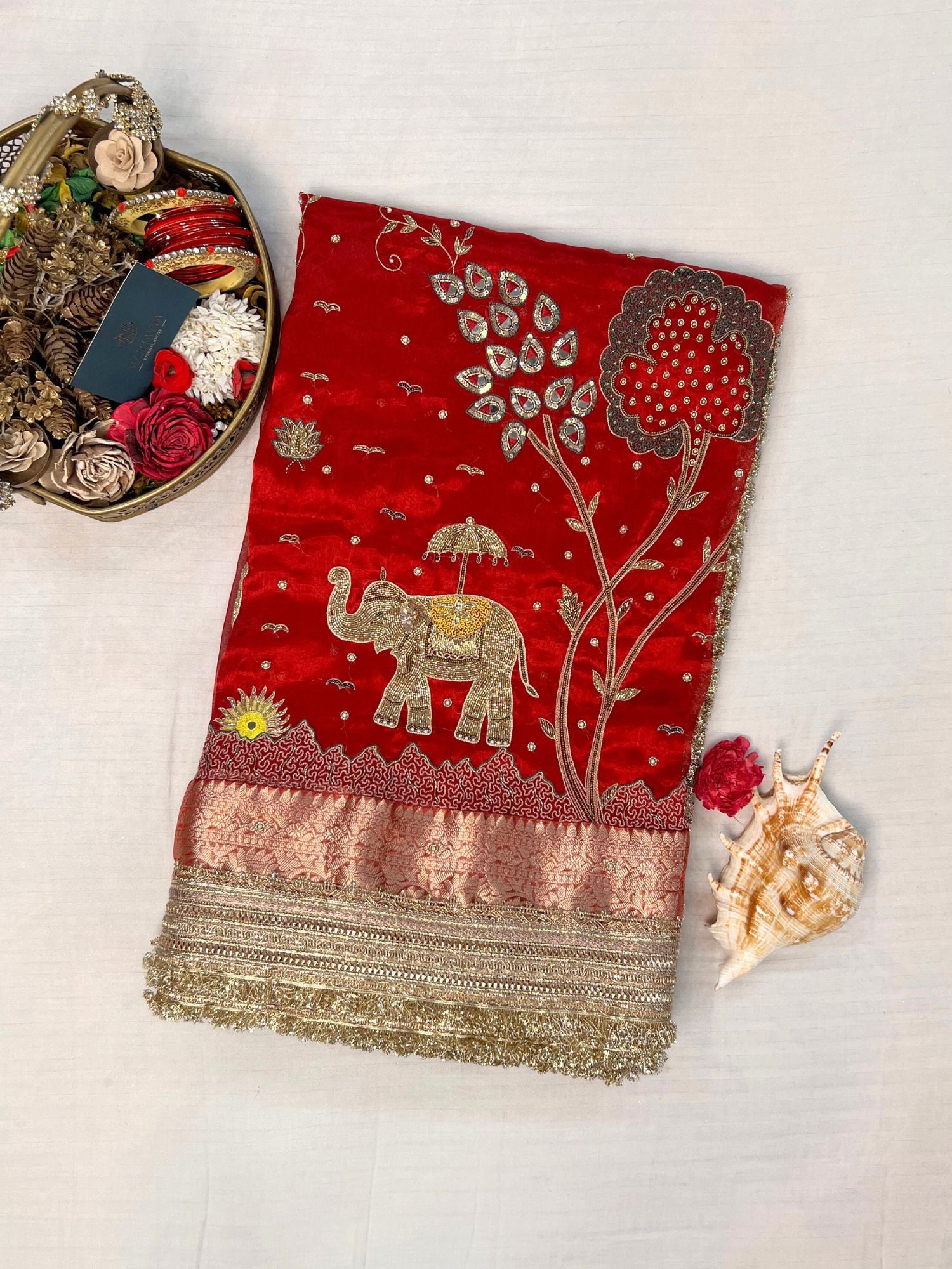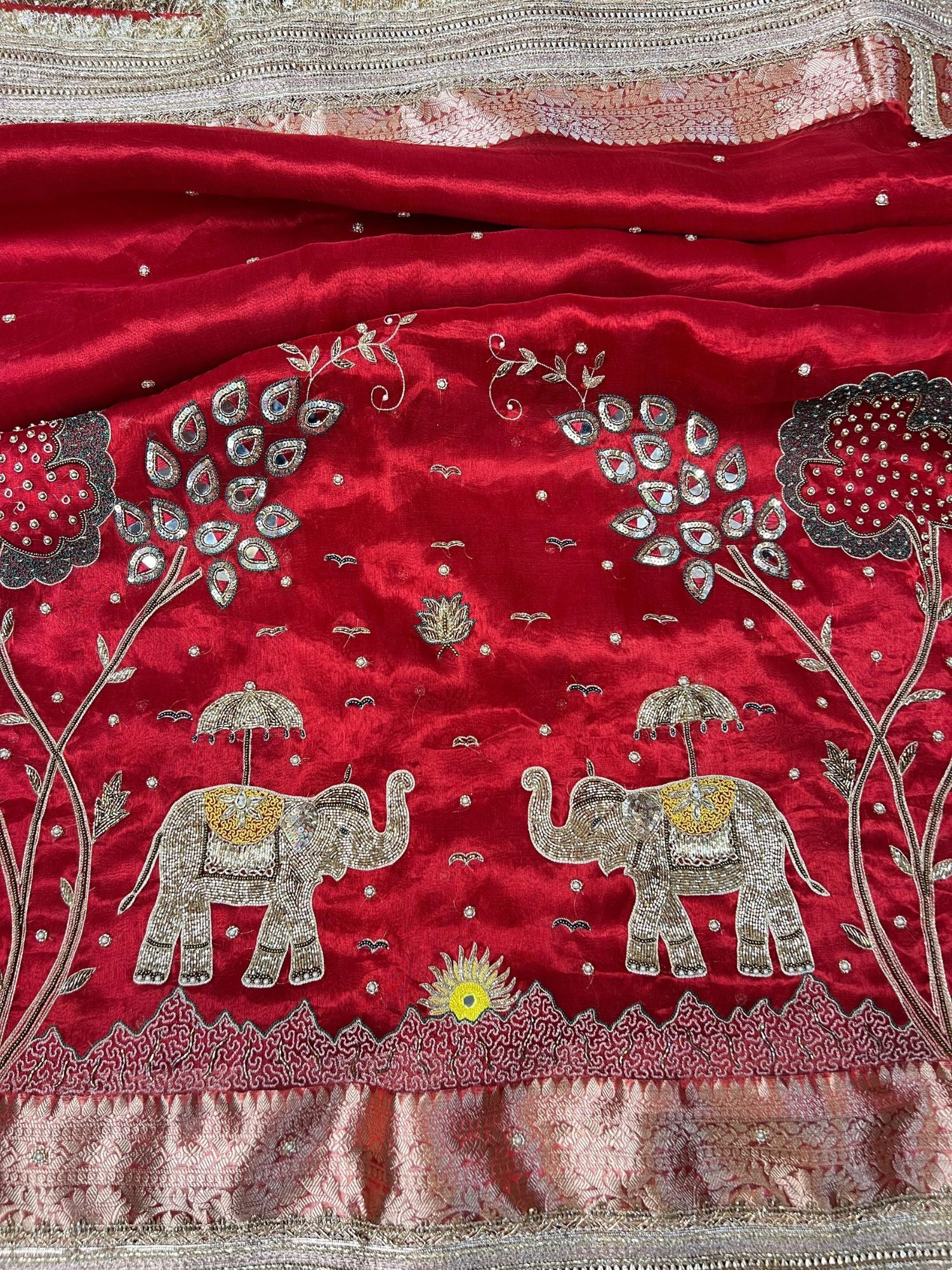 Royal Red Banarasi Tissue Silk Saree with Forest Motifs
