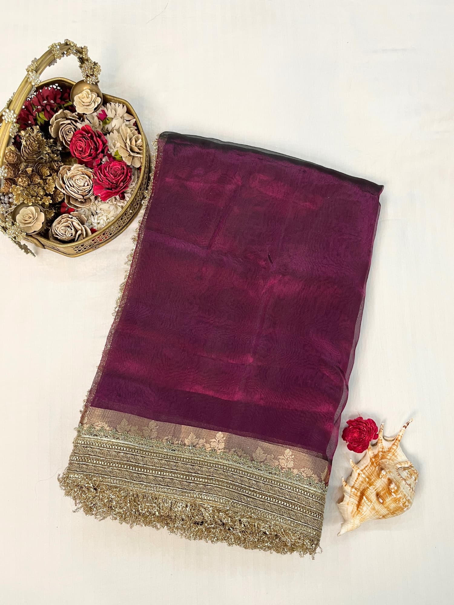 This Wine Pure Banarasi Tissue Silk Saree with Gota Patti Border offers a perfect blend of luxury and tradition. Its shimmering fabric and intricate detailing make it ideal for weddings and festive occasions.