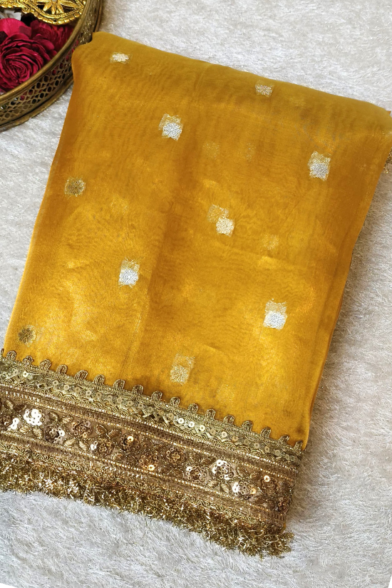 Elevate your style with our Yellow Buti Pure Banarasi Tissue Silk Saree. Featuring intricate handwoven butti motifs and a shimmering Gota Patti border, this saree exudes elegance and grace. Perfect for weddings, festivals, and special occasions. Crafted from premium tissue silk for a luxurious finish.